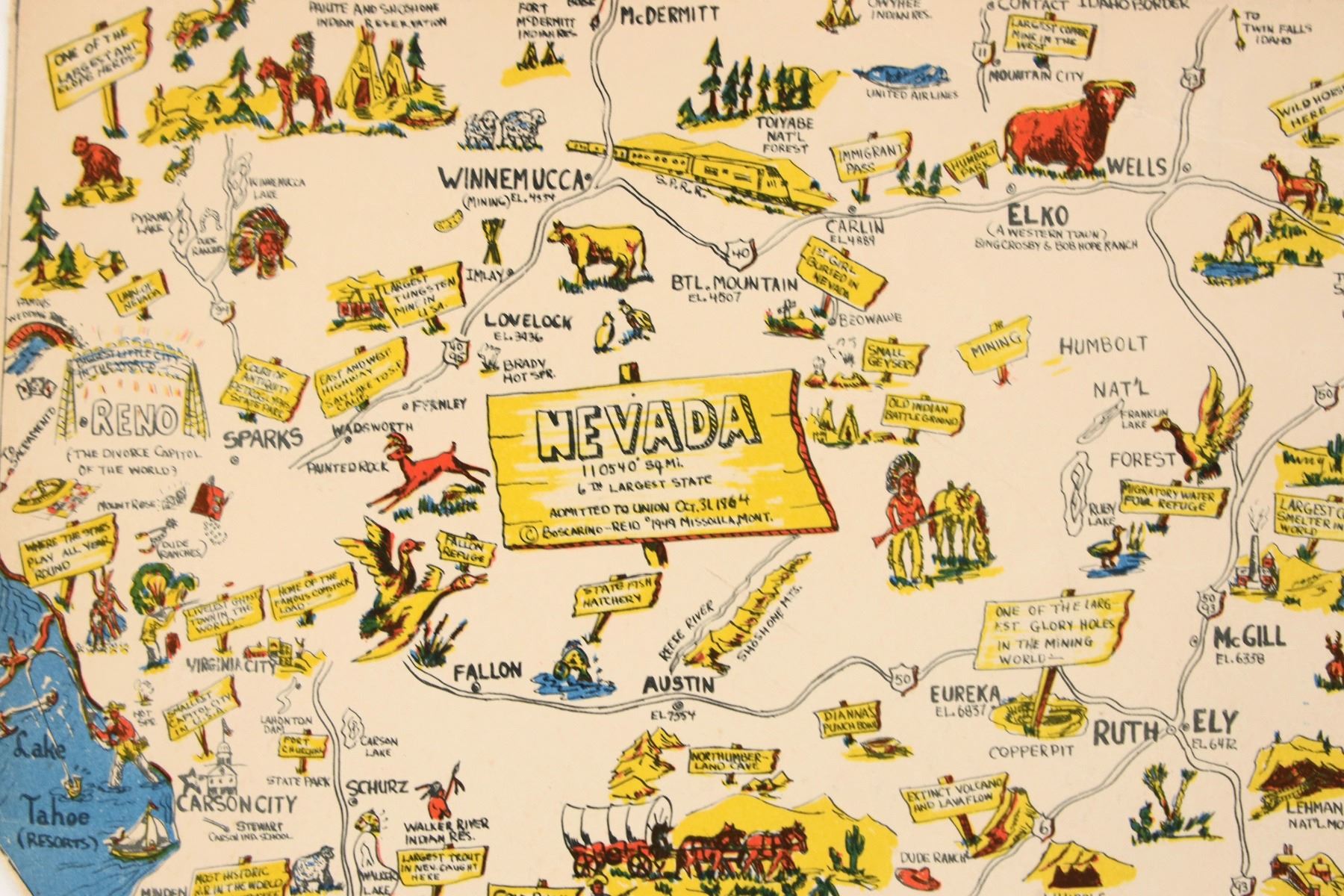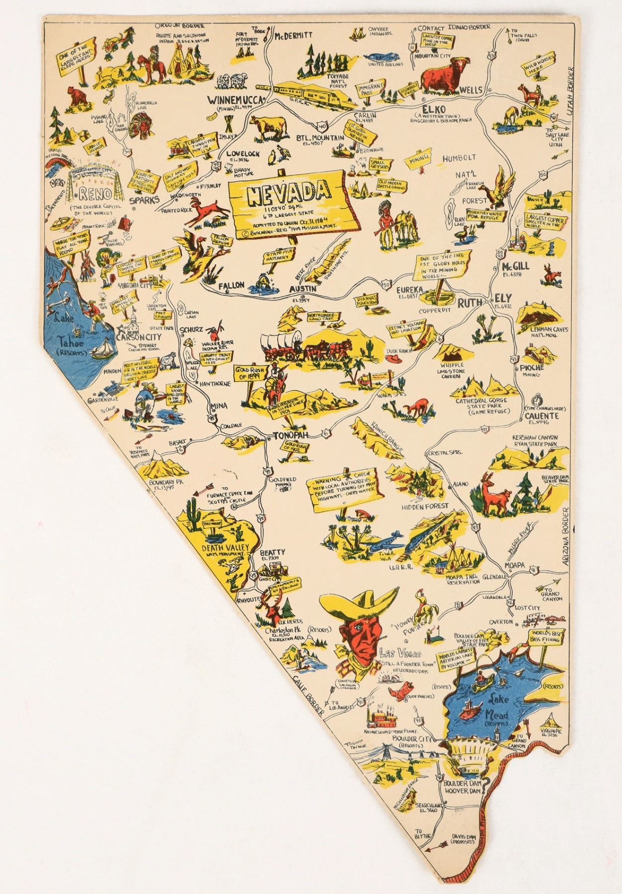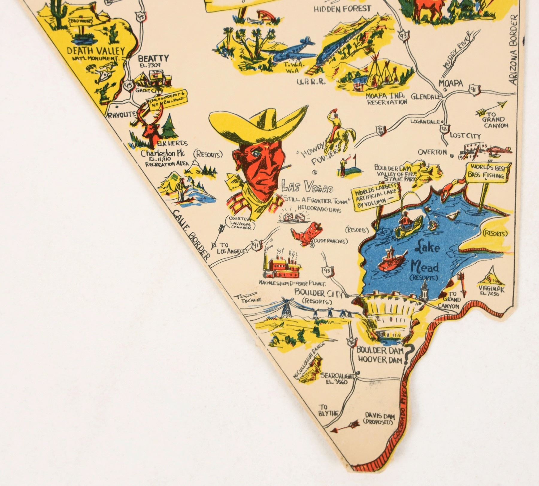 Las Vegas Souvenir Group. Las Vegas City Map, Boulder Dam Pictorial Booklet, Harrah's Club Nevada Caricature Postcard Map. Oversized. 6 x 9.5 inches.