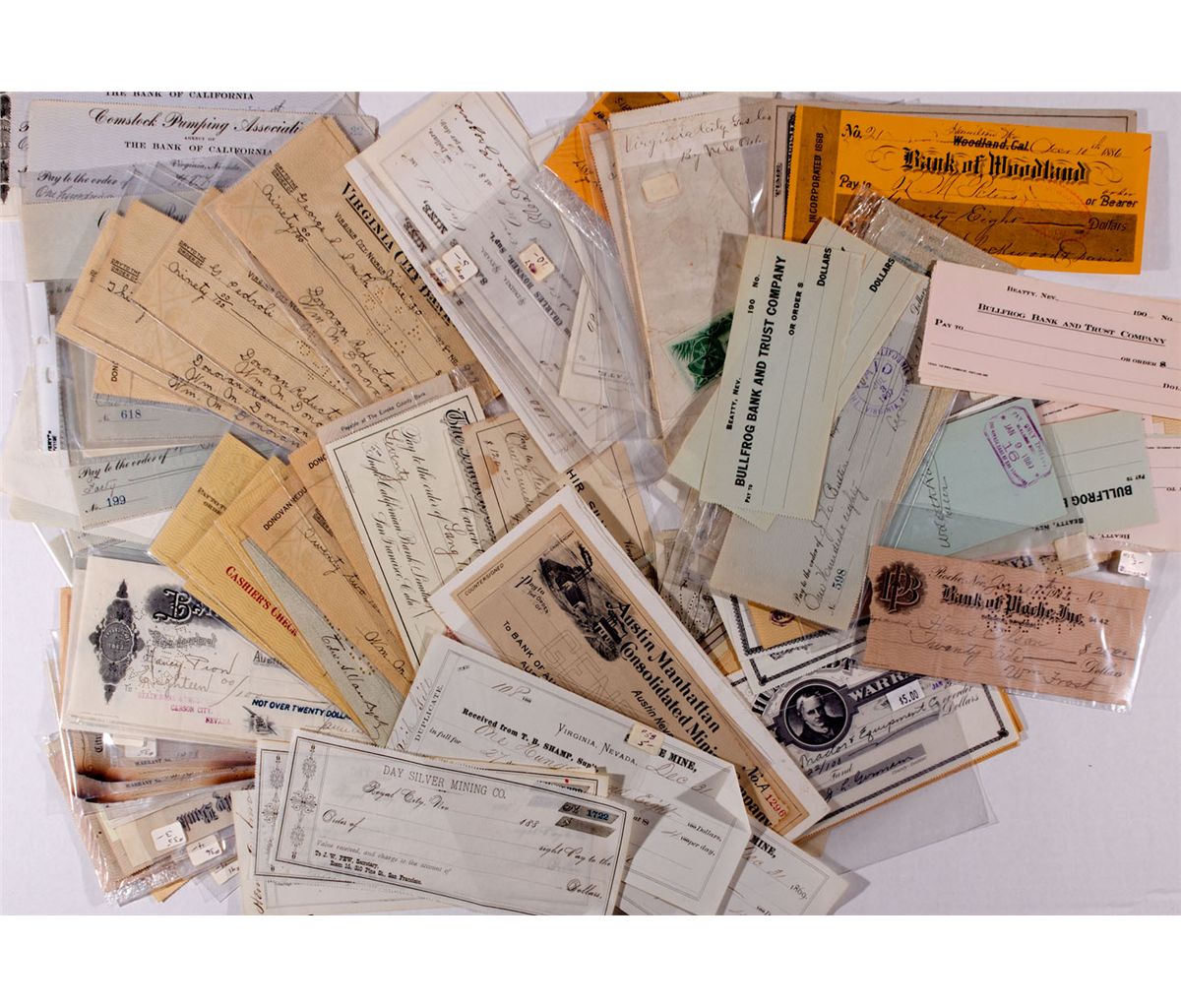 c1900 - Lot of 170. Large swath of Nevada bank checks drawn on a variety of regional banks. Some from Virginia City, Beatty, Las Vegas and Lovelock. Most of these checks have been issued and cancelled though a few have not. Includes bank checks drawn on a variety of Nevada Banks (only a few are unissued.) Includes stubs for stock certs 723 & 729 (Comstock Tunnel Co.) All in great condition. Grab this vast collection of checks to add to or start your collection.
