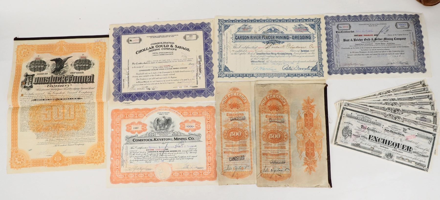 Lot of 18. I/U, I/C. Issued 1889-1947. VG or better. I.E.; 1. Three The Comstock Tunnel Co. 4% , 20 year gold bearer bond, coupons attached. F cond. 2. Ten Chollar Gold and Silver Mining Co., Virginia Mining Dist. Storey County. 3. Carson River Placer Mining and Dredging Co. . and four more.
