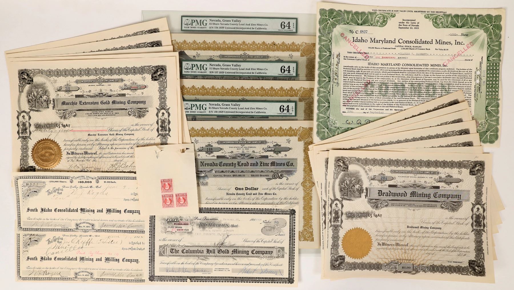 Lot of 19. Mix of issued and unissued. Includes: South Idaho Cons. Mining & Milling Co. (2 stocks, Grass Valley, 1896); Murchie Extension Gold Mining Company (5 stocks, signed by corporate offices but not issued, Nevada City, c.1906); Deadwood Mining Company (7 unissued stocks); Columbia Hill Gold Mining Co. (1961); Idaho Maryland Cons. Mines, Inc. (1933); and Nevada County Lead & Zinc Mines Co. (3 unissued stocks in PMG holders).