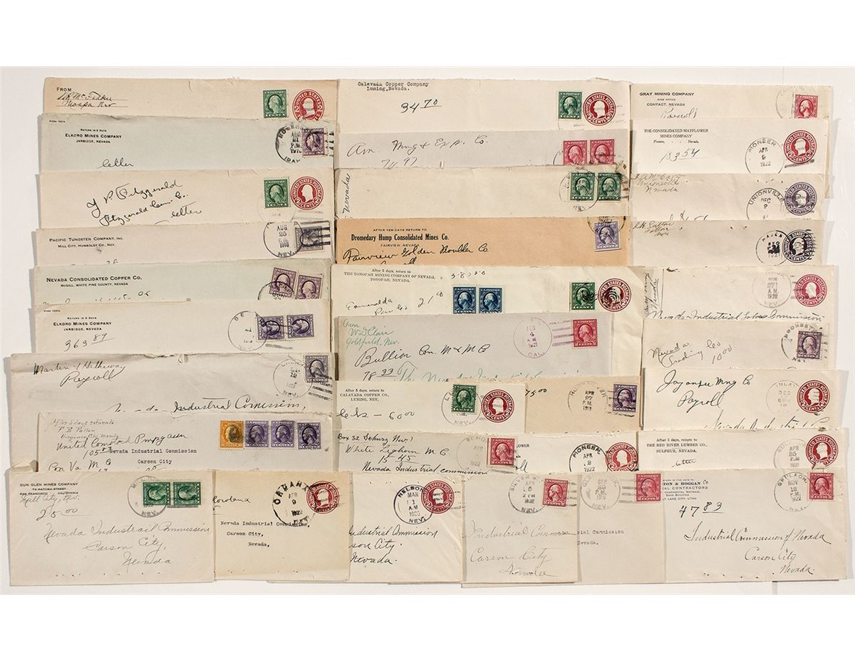 c This a lotof about two dozen postal covers from various towns in Nevada, including Glenbrook, Oreana, Fairview, Luning. Virginia City and many more. Most have large circle cancellations and a few have corner advertising, like the Dromedary Hump Consolidated Mines Company. This is part of former Nevada State Tresurer Dan Franks' Collection. - HKA#66001