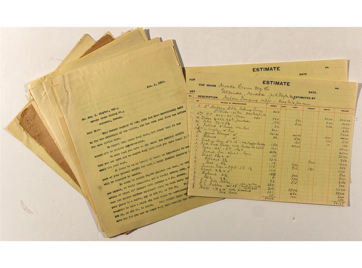 Letters, specifications, and estimates from D. D. Demarest Co. to Nevada Crown Mining Co.