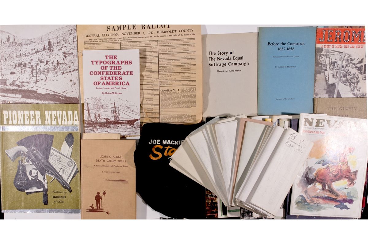 A plethora of Nevada magazines, books, letters and assorted items for the collector: a Sample Ballot from 1942 Humboldt County Election, a stack of sealed City Budgets of Winnemucca, dated 1920 through 1943, multiple Nevada Highways and Parks magazines (various dates), a Jerome Arizona Booklet (not Nevada but close), an illustrated book titled "Loafing Along Death Valley Trails" from 1951, "The Gilpin Tram" book, copy 107 from 200, a "Pioneer Nevada" book from Harold`s Club of Reno, "The Typographs of the Confederate States of America" book, a photography booklet titled "Pioneer Photography of the Great Basin," and last but not least, a Dealer`s apron from "Joe Mackie`s STAR" Winnemucca casino. -60279