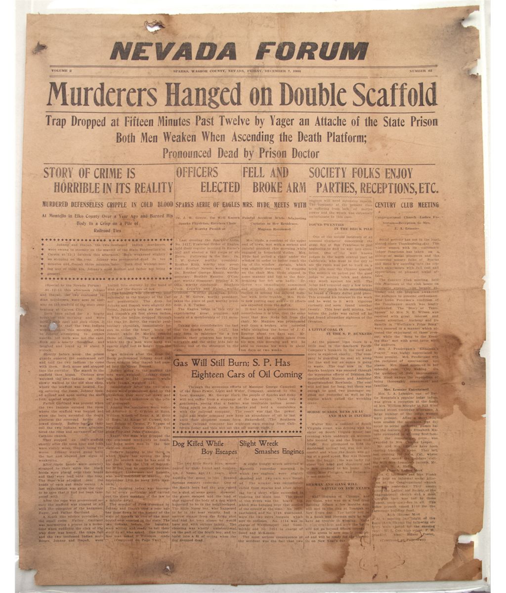Indians Johnny and Ibapah, self-confessed murders, were hung in Carson for murder in Montello. Reno and Sparks will not lose gas service with an emergency load of 18 railroad cars coming in on the SP. Aerie of Eagles elects officers. As with all old newspapers the paper is very fragile, but the historical value in articles and advertising is tremendous. Due to size, additional shipping fees may be required.