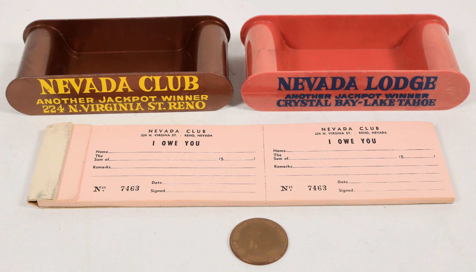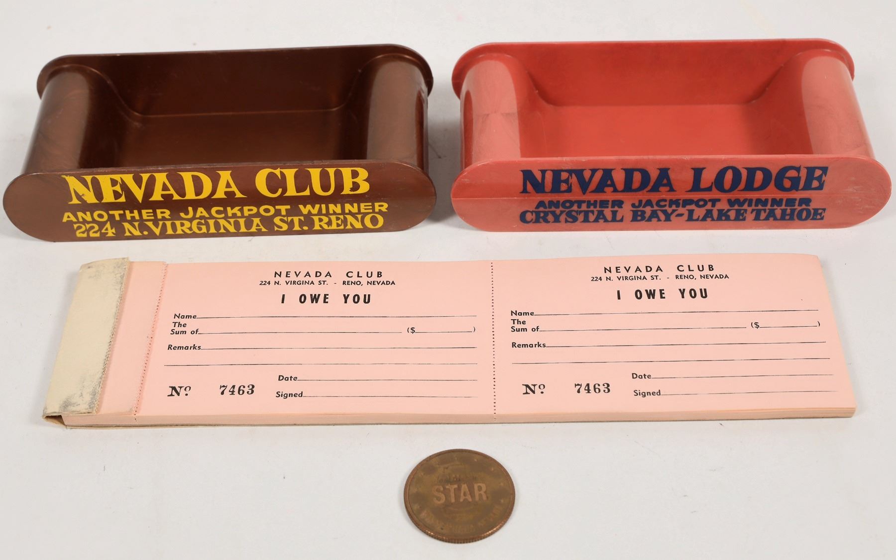 Very rare "IOU" slips for Nevada Club on N. Virginia St, c1950. Includes gaming token and two plastic trays, one for Nevada Club and one for Nevada Lodge. Good condition, see photo.