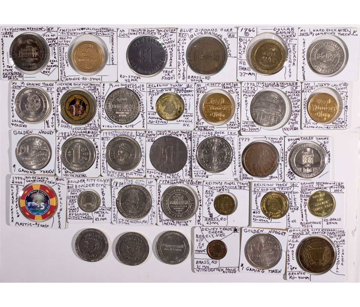 Lot of 33 including many gaming tokens, brothel tokens, and other items of interest such as a Blue Diamond So-Called Dollar, and a Boulder City token. -60905