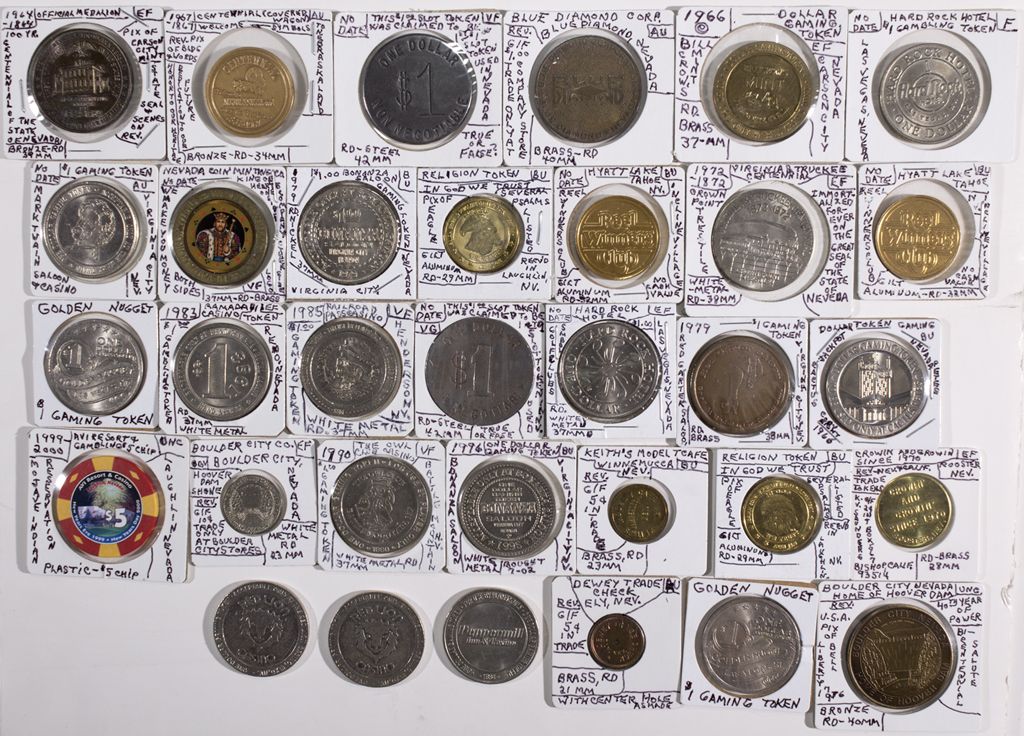 Lot of 33 including many gaming tokens, brothel tokens, and other items of interest such as a Blue Diamond So-Called Dollar, and a Boulder City token.City: County: State: NVDate: