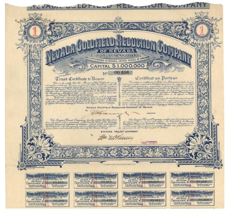 Nevada. Trust certificate for 1 share of capital stock. Blue. Ornate border design with text written in both English and French. Coupons attached at bottom. Small rust stain at left border from staple. Folds. Uncancelled and fine.