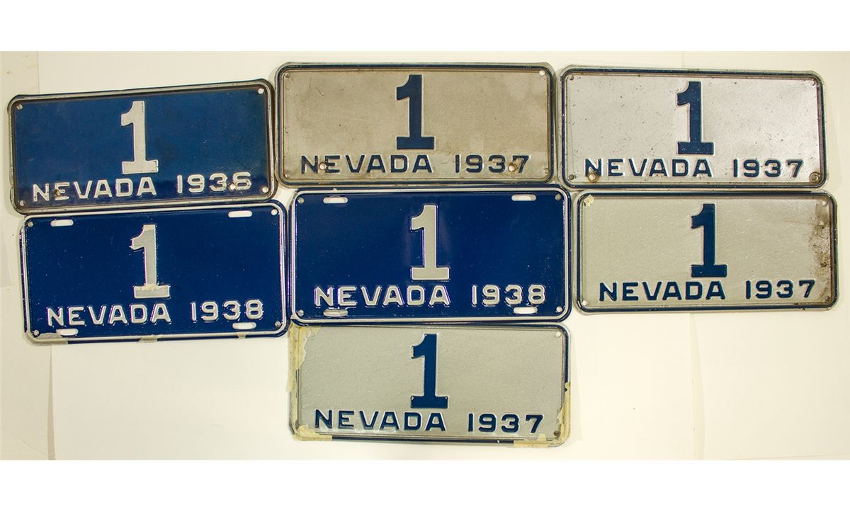 c1936 Lotr of 7: 2 are matched pairs, not mounted on a vehicle, from 1937 & 1938, in mint condition. The others are 1936 and 1937, respectively. These have been mounted and run on a car. These Nevada "1" plates are reserved exclusively for the elected state governor. One of the envelopes that holds the plates has a written "extra" on it. Extremely rare. Some Extra #1 plates may have been made for promotion. - HKA#65969