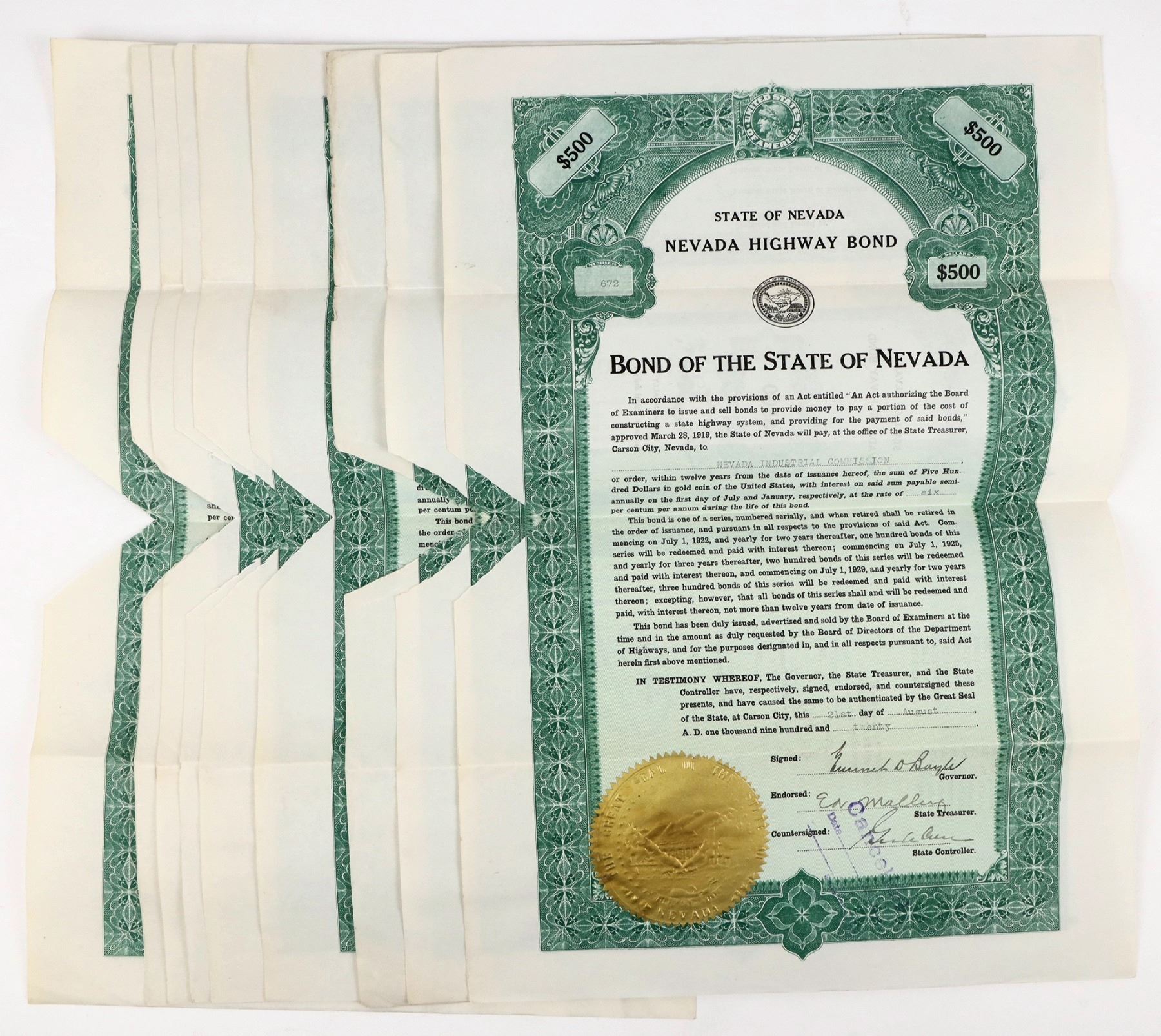 Ten (10) Nevada Highway Bonds, Signed by NV Governor Boyle, 1920. Cut cancelled at left. NV Gov Emmet D. Boyle was a mining engineer turned politician. His mining claim to fame was the location of, and mining of the extension of the gold-silver ore at Como.