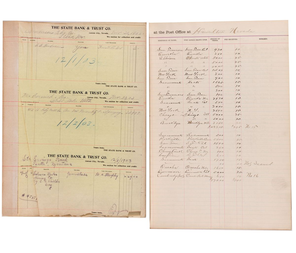 c1883 - Lot of 2: 1 is the "State Bank & Trust Co."Check register, dated 1903. This book is composed of yellow carbon paper check receipts, all hand-written script. Measures 14"x11". 2 is a Post Office register from Hamilton, dated 1883. This illustrates all transactions via the post office in town, all inscribed in a flowing hand. Measures 115"x11". Both are in good to very good condition, and offer a rare insight into business of the period. - Gil Schmidtmann Collection -61856