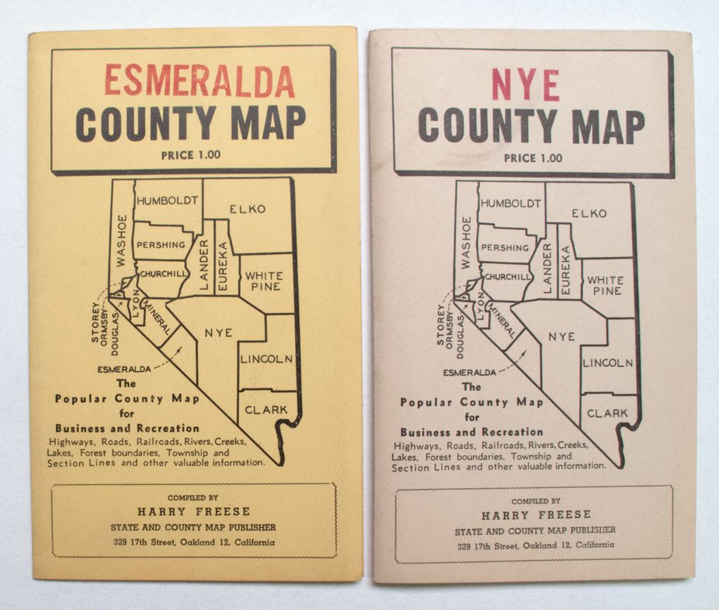 REAT RESOURCES for the explorer! Lot of 2 early county maps—one of Esmeralda County and the other of Nye County—folded into brochure form. Compiled by Harry Freese, State and County Map Publisher in Oakland, CA.