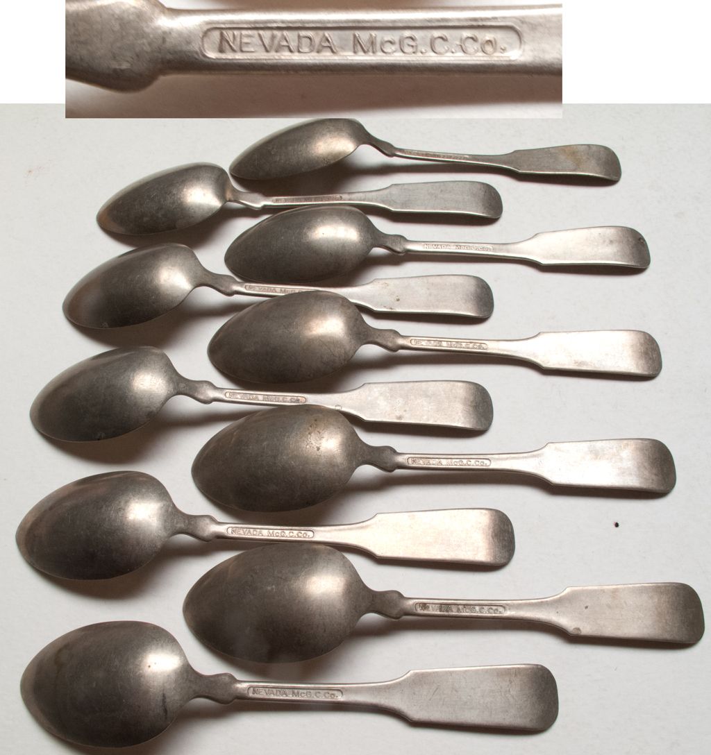 Group of 10 nickel silver teaspoons. Hallmarked Nevada McG.C.Co. Made by McGlashan Clarke & Co. Birmingham, England. Silver-plated nickel silver; no silver plate remains. Probably for hotel use. All identical in a traditional “rattail” pattern.City: BirminghamCounty: State: