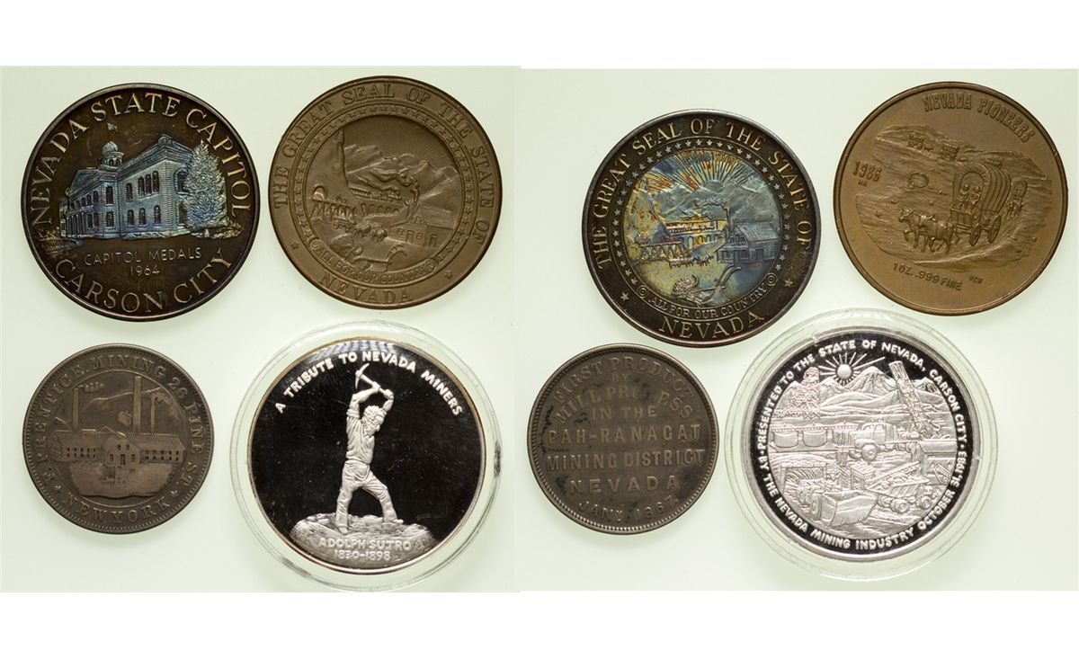 Lot of 4: 1) First product by mill process in the Pah-Ranagat Mining District 1867, F. Prentice mining New York; 2) 1964 Nevada State Capitol medal; 3) Nevada Pioneers, 1986; 4) A Tribute to Nevada Miners, Adolph Sutro. - Jacobitz Collection -59822