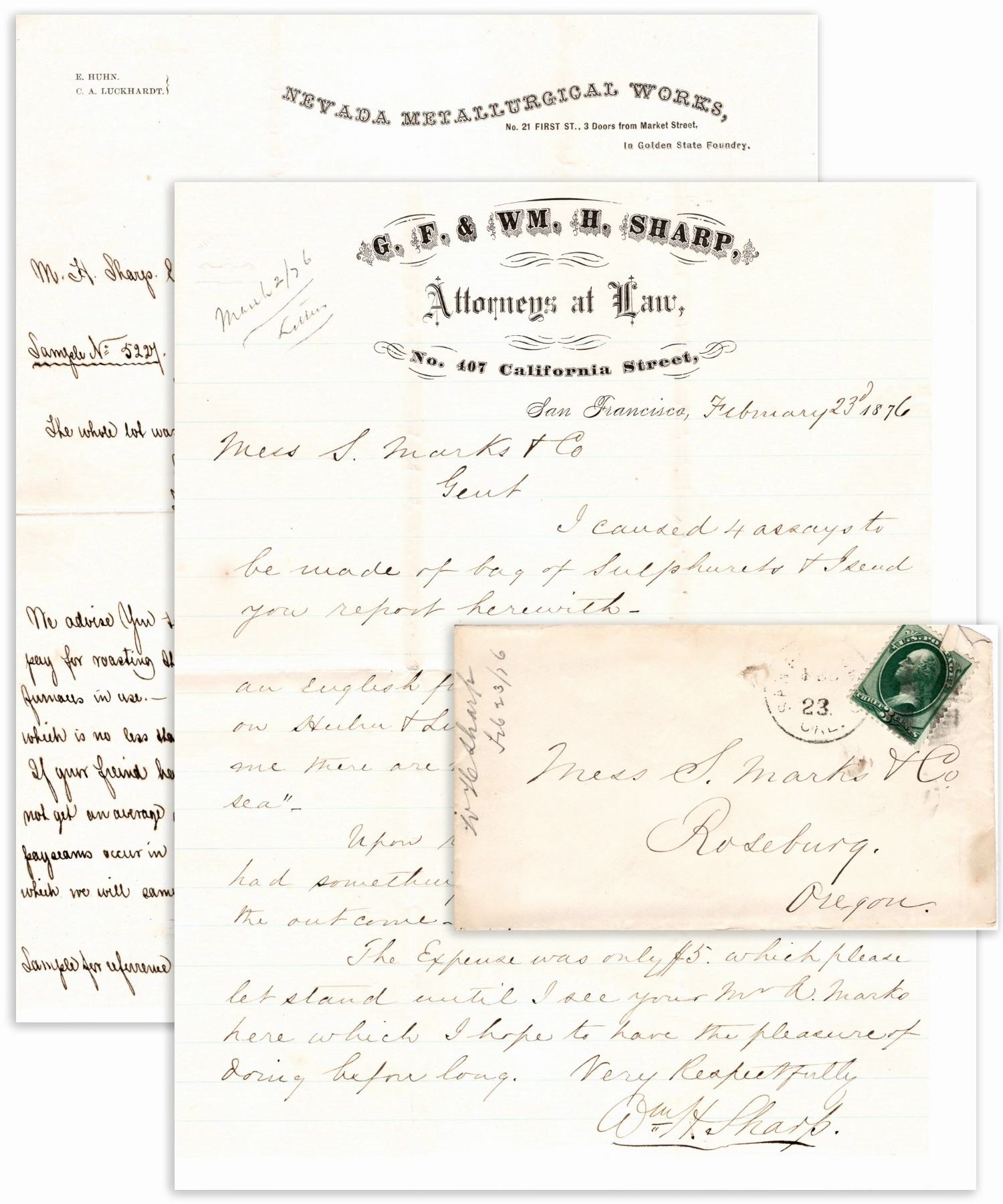 Nevada Metallurgical Works Letterhead and Envelope Ò Assayers E. Huhn and C.A. Luckhardt, San Francisco, CA, Dated February 21st, 1876 Ò Letter to Mr. H. Sharps of S. Mark & Co. in Roseburg, Oregon concerning the assay of a sample of sulphurets. The contents of the letter (cover enclosed) discuss the refining costs per ton for roasting at least $8.50 and the additional costs of amalgamation or chlorination at $4.00 per ton. In the mid 1860Ìs Luckhardt was hired by William Sharon of the Virginia City Branch of the Bank of California to assess which mining and mill properties the bank should buy out during a depression on the Comstock. In 1881 J.M. Seymour and C.A. Luckhardt represented the South Pacific Mining Co. a worthless property and added to the board of directors some respected individuals not previously associated with mining scams and promoted the property until it became the speculative favorite of Broadway. The price went from $1 par to over $14. They made millions at the expense of unsuspecting market players and investors. [Lingenfelter, 1986, Death Valley & the Amargosa, p. 158-159]. Signed Huhn & Luckhardt. Size: 8 x 10 inches. San Francisco California 1876