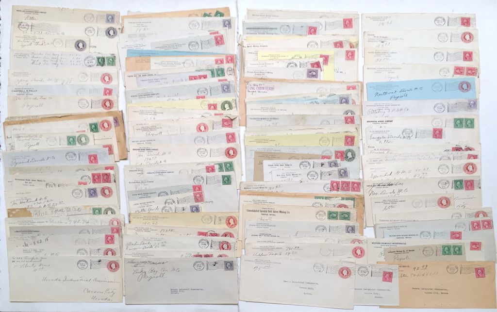 Almost all Tonopah cancels. Mines include White Caps, Tonopah Belmont, Ben Hur, Reveille, Pyramid Divide, Blue Horse, Aztec, Mammoth Divide, Brougher Divide, Monarch Pittsburg, Copper Bell, Tonopah North Star, Tonopah Gold Zone, Horseshoe Divide, Tonopah Extension, Belcher Divide, Stone Cabin, Super Six, Jim's Divide, Royal Divide, Jim Butler, Luning Consolidated, Lafayette, Manhattan Morning Glory, Silver King, Consolidated Spanish Belt, Montana-Tonopah, etc.