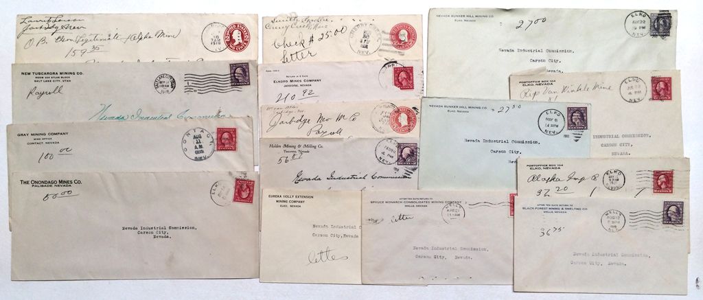 Cancels include Cherry Creek, Elko, Jarbidge (weak), Contact, and Wells. Other corner covers include Palisade and Tuscarora. Mines include Alpha, Elkoro, Holden, Jarbidge, New Tuscarora, Eureka Holly, Nevada Bunker Hill, Rip Van Winkle, Gray, Onondago, etc. Some duplicate mines all different corner covers.
