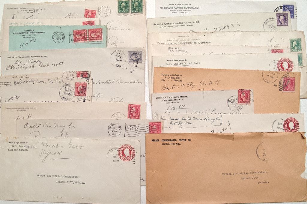 Cancels include Ely, East Ely, McGill, Kimberly. Other corner covers include Schellbourne, and Ruth (rightside of envelope missing). Mines include Ruth Consolidated, Butte Divide, Ward, ACME, Kennecott, Nevada Consolidated, Kimberly Consolidated, Consolidated Copper mines, Arrowhead, Minerva, Lake Valley, White Pine Lead. Some duplicate mines all different corner covers.