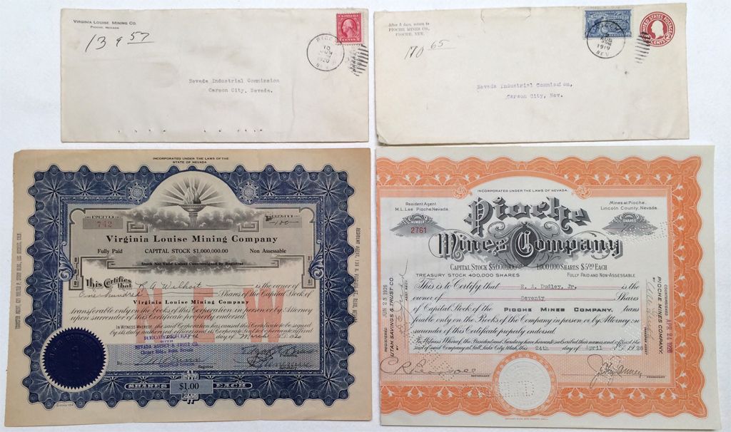1) Pioche Mines Company. Cover 1919 with a "Special Delivery" stamp. Stock 1926 for 70 shares to EA Dudley Number 2761. 2) Virginia Louise Mining Company. Cover 1920. Stock number 742 for 100 shares in 1930.
