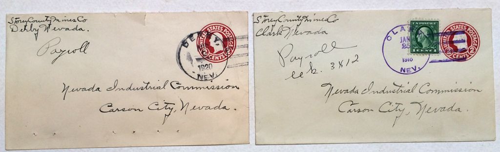 Nicer pair that shows a progression of post offices. The Storey County Mines Company used Clark (1912-1919, R5) as their post office in 1918. When it closed, they had to switch to Derby (1906-1922, R4) in Washoe County. These are two small post offices between Fernley and Reno on the original Central Pacific Railroad.