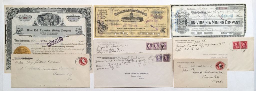 1) Con. Virginia. Cover c1920. Stock number 12830 for 100 shares in 1911. Cancelled. 2) Union Consolidated. Three different covers: circa 1920. Stock number 24863 for 1000 shares to RL Rader in 1927. 3) West End. Cover 1920. Stock number 1792 for 1000 shares in 1927.