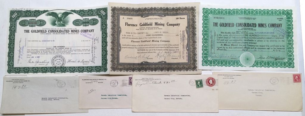 1&2) Goldfield Consolidated Mines. Two covers 1918 and 1921. Two stocks. One signed by Wingfield. 1953 and 1961. 3) Florence Mining Company. Two covers: 1918 and 1919. Stock number A10468 for 100 shares to James McCreedy in 1926.
