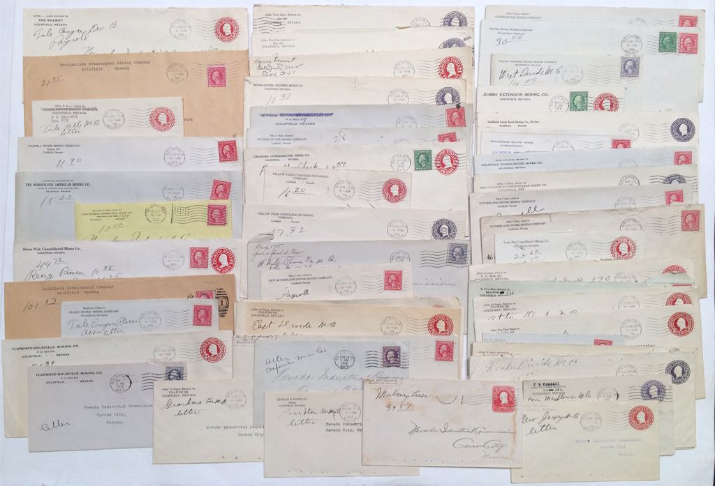 Almost all Goldfield Cancels. Mines include Goldfield Consolidated, Florence Goldfield, Reorganized Pioneer, Grandma, Lone Star, Montezuma, Jumbo Extension, Yellow Tiger, Con. Mayflower from J. B. Kendall, Allied Divide, Goldfield Development, Hornsilver American, Arrowhead, Reorganized Crackerjack, and Tule Canyon Development Company from the desk of the Esmeralda sheriff. Some duplicate mines all different corner covers.