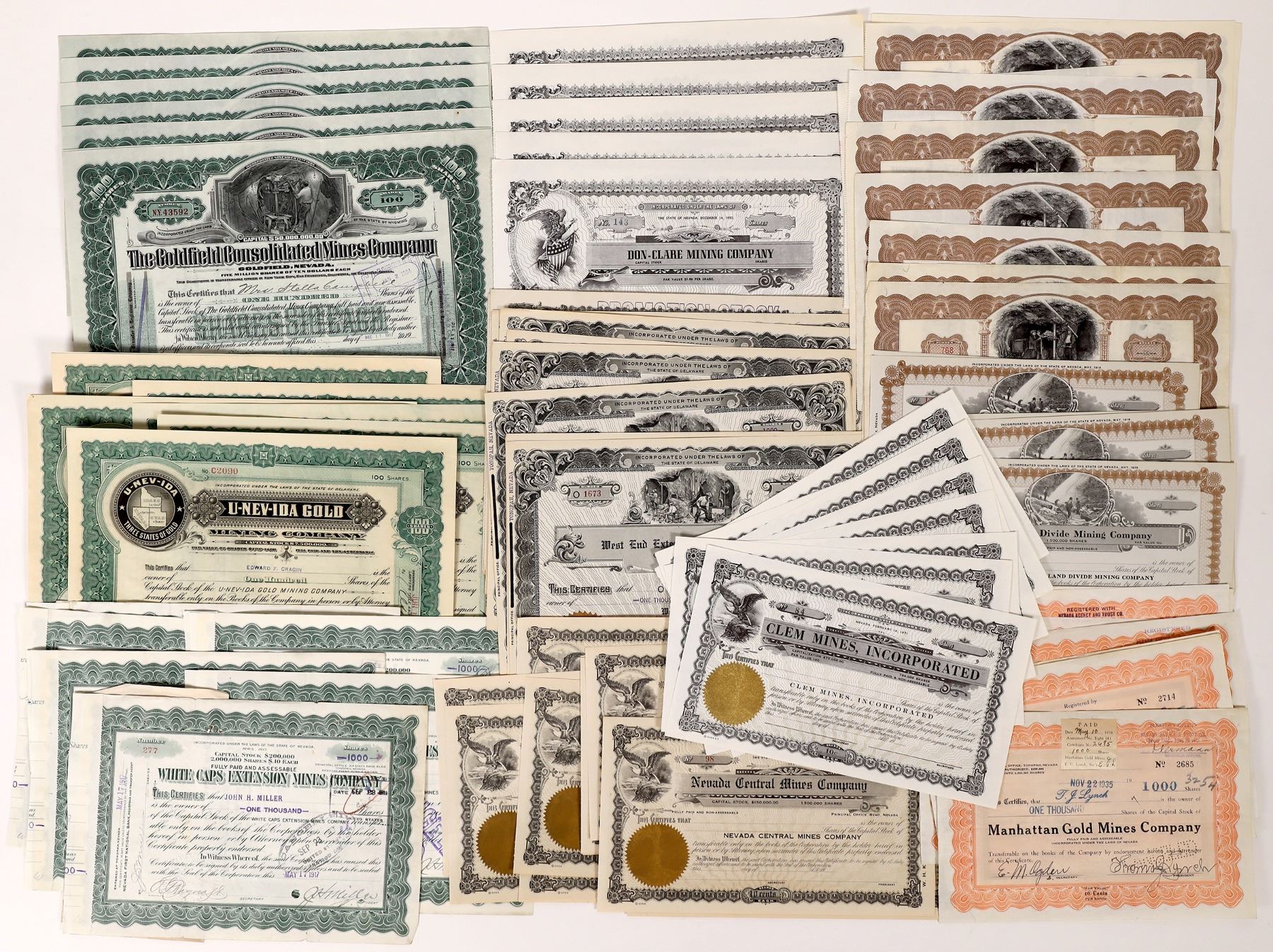 110 Nevada mining stocks. 10 each from 11 mines including some scarce ones. U-Nev-Ida. Clem, well known assayer. Don Clare, eccentric Southern Nevada miner. White Caps, Manhattan. Manhattan Gold, Manhattan. Mendha, Pioche. West End Ext, Tonopah. Large Goldfield Cons. Cumberland Divide, Tonopah Divide. Nevada Central, Eureka area. West End, Tonopah.