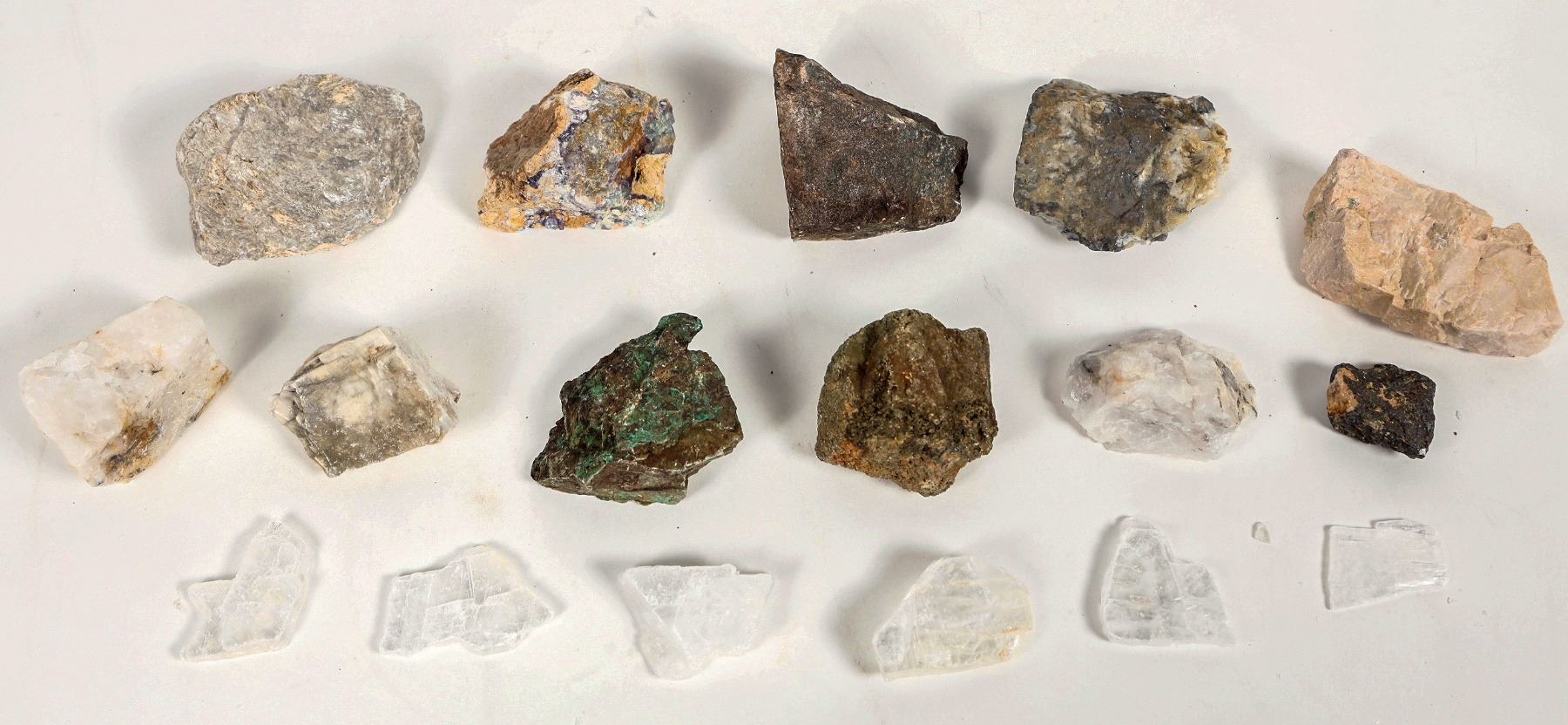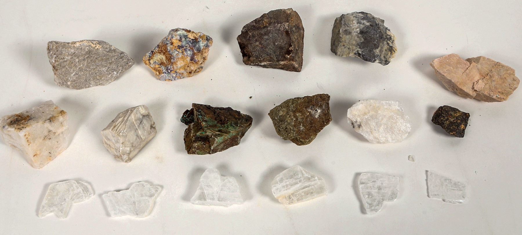 Black plastic case (13 x 9 x 3 inches) entitled "Nevada Mining And You," containing twelve kinds of Nevada rocks: Barite; Fluorite; Garnet; Galena; Feldspar; Gypsum; Calcite; Magnetite; Malachite; Pyrite; Quartz; Sulfur. Printed by the Nevada Commission on Mineral Resources is a fact sheet about each mineral. Edited 2008.