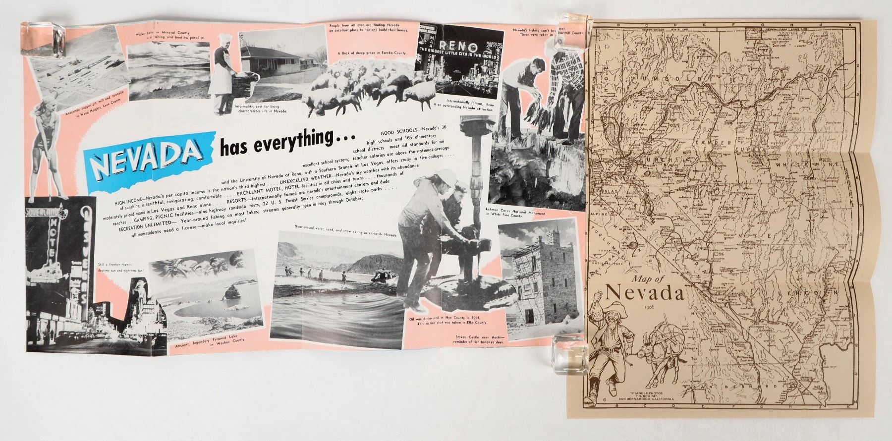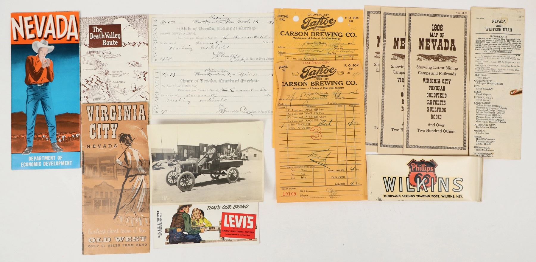 Nevada Miscellaneous Ephemera includes Death Valley, Virginia City, and other promo materials, photograph, billheads, receipts, State Automobile Assoc. info and more. See photo.