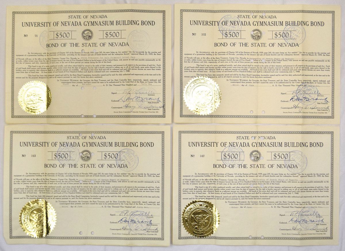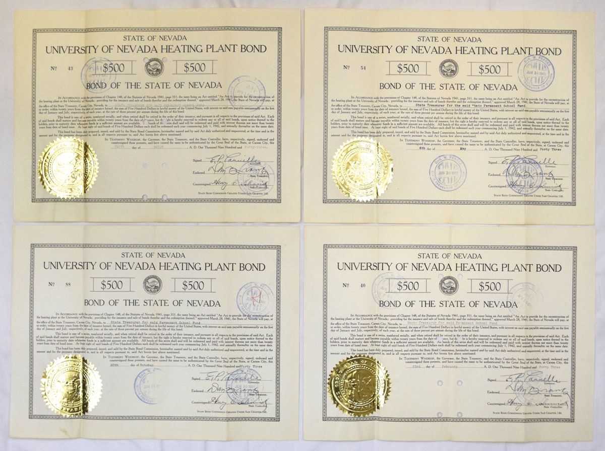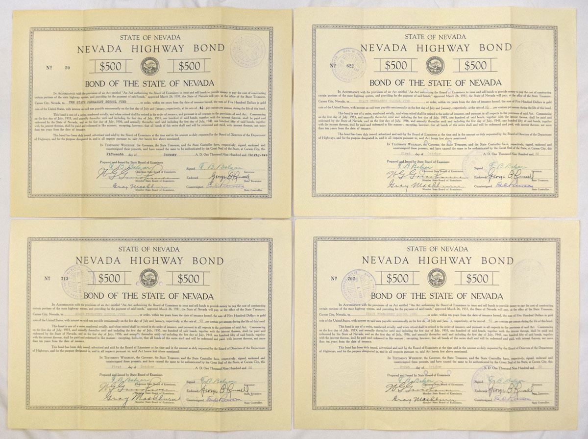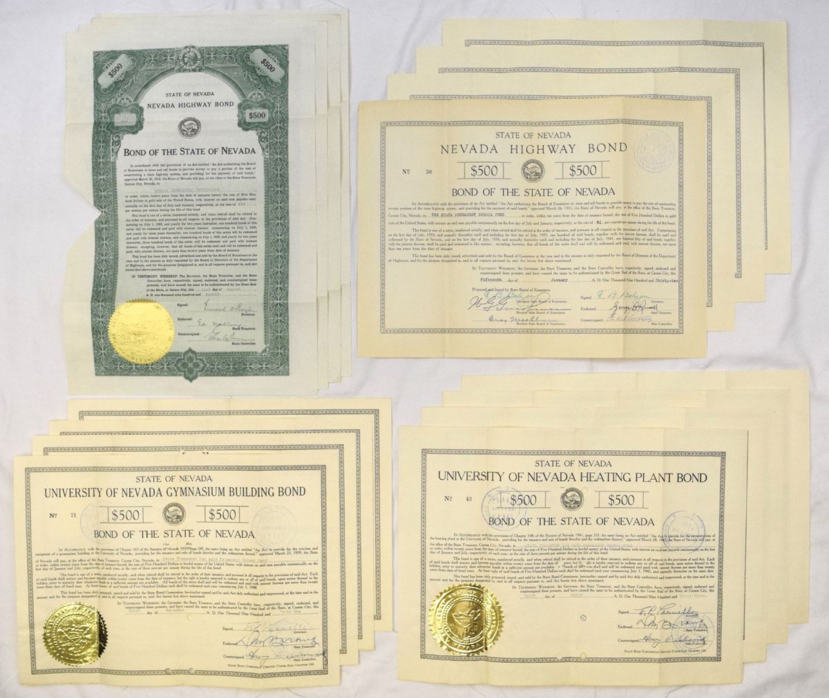 Nevada, 1920-43. Lot of 16 Issued State of Nevada bonds representing highway infrastructure and University of Nevada capital projects, Includes: 1920, Nevada Highway Bond (4) signed by Governor Emmet D. Boyle; 1932, Nevada Highway Bonds (4) signed by Governor Fred B. Balzar; 1941, University of Nevada Gymnasium Building Bonds (4) signed by Governor Edward P. Carville; and University of Nevada Heating Plant Bonds (4) signed by Governor Edward P. Carville. Bonds are issued in $500 denominations with engraved borders, state seals, countersignatures, and official endorsements. Condition ranges from VF to XF overall, with folds, punch cancellations, light toning, and typical handling wear. (16). Sold “AS IS” no returns accepted.