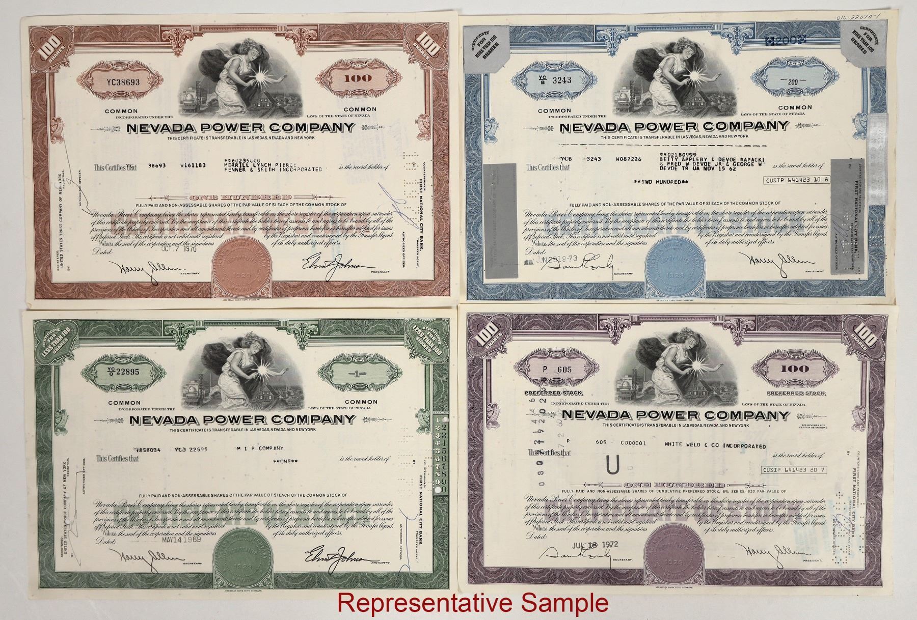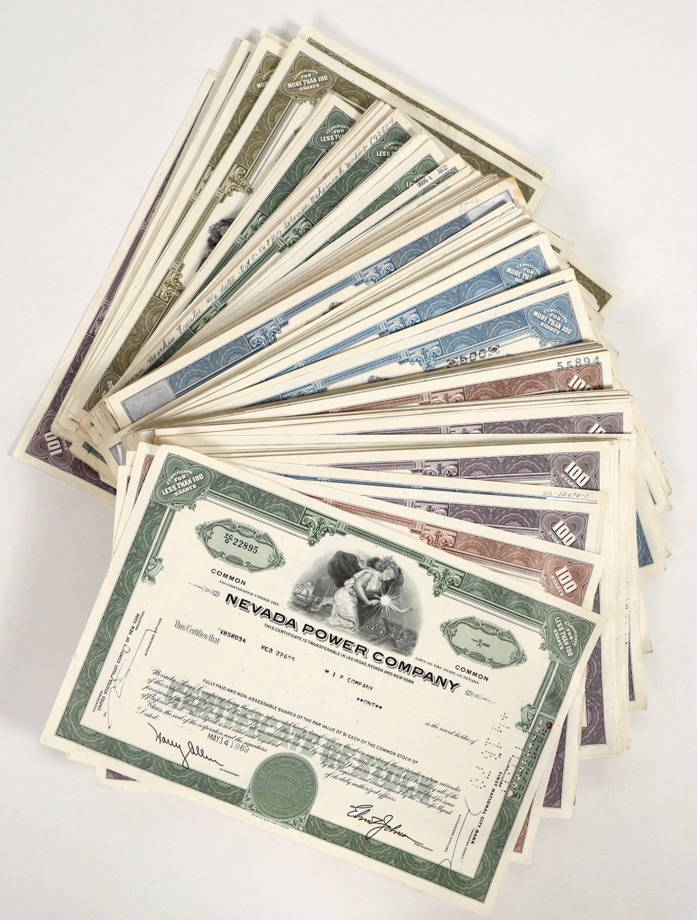 A 2.5 inch stack of Nevada power Company Stocks c. 1965-1975 About 400? Varieties. Purple, brown, green, blue, light green
