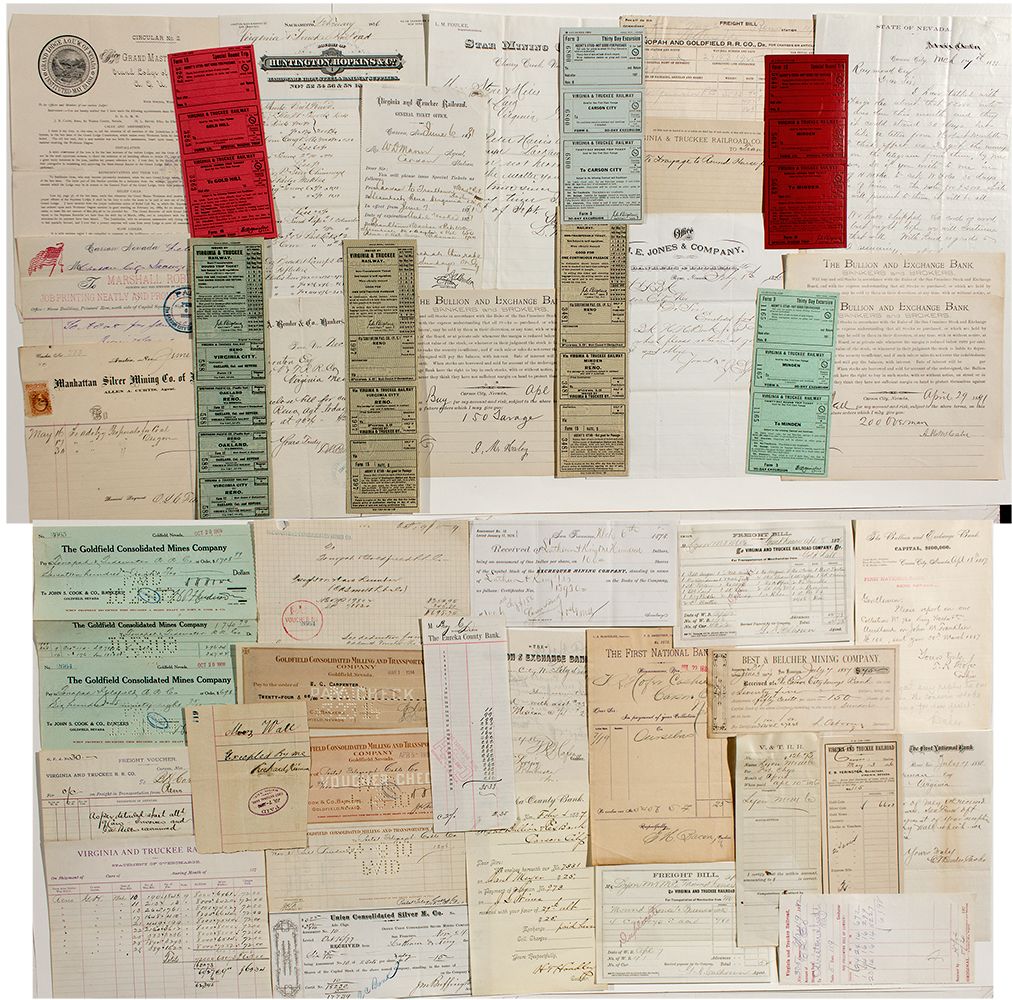 1861 Collection of 57 documents, all pre1900 except T&G. Virginia & Truckee Railroad (30); T&G Railroad (4); CPRR (2); Nevada Banks (11), NV Mining (6); Goldfield (2), Others (2). Lynn Langdon Collection - HKA#65618