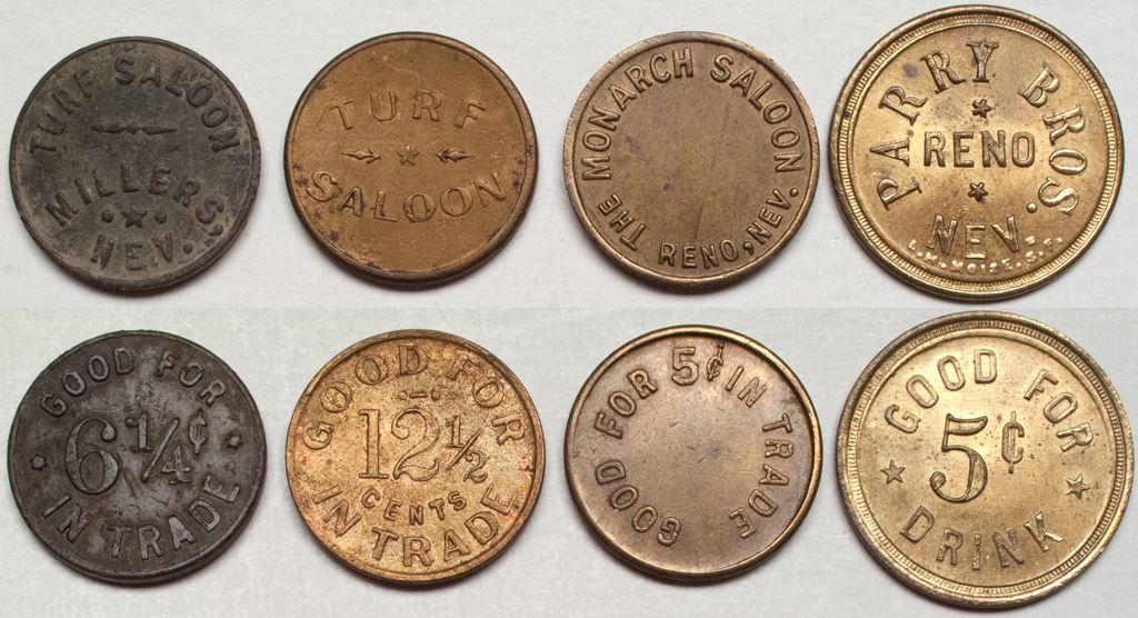 1) The Monarch Saloon / Reno, Nevada // GF 5c IT. 2) Turf Saloon / GF 12 1/2cents IT. Blair, Nevada token. 3) Turf Saloon / Millers/ Nev // GF 6 1/4c IT. 4) Parry Bros / Reno / Nev // Go 5c drink.City: County: State: NVDate: