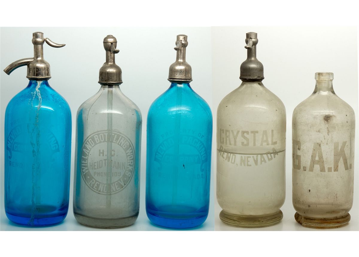 1) A 9” tall, without top, seltzer etched “G.A.K.” in large block letters. Footed bottom bears no makers mark and bears a large chip. Gus Krenkle produced this small seltzer bottle for the Humboldt Soda Works. G.A.K. Hutchinson soda bottles are common, but this seltzer bottle is considered rare [Ref: Nevada History Through Glass, Vol 1, Fred Holabird, 2012, pp. 84-5]. Clear glass, dirty, small chips and dings. 2) An 11.5” tall, with unmarked top, seltzer etched “CRYSTAL/ RENO, NEVADA.” Footed base bears no maker’s mark. Clear glass, small chips throughout body, siphon tube shattered, half full. 3) An 11.5” tall, with top, seltzer bottle etched WIELAND BOTTLING WORKS RENO NEV./ H.C. HEIDTMANN/ PHONE 109”. The top is engraved “W.B.W.”, small chip in siphon tube. No maker’s mark. Clear glass, no chips or cracks, stained. 3) Two 11.5” tall, with matching chrome tops, “PROPERTY OF/ NEVADA PACKING/ COMPANY/ RENO, NEVADA.” seltzers with “MADE/ IN/ CZECHO-SLOVAKIA” maker’s marks. Cobalt glass, no chips or cracks, few small bubbles, stained, still contain liquid. -60175