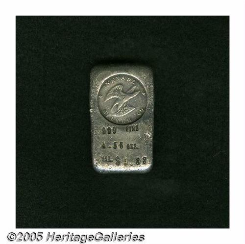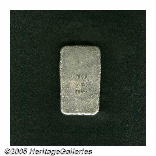 <B>Nevada Silver Co. Silver Ingot, Rawhide, Nevada, 1919-ca. 1920s.</B></I> The Nevada Silver Company was officially organized in 1919 by a group of Idaho lawyers. Their resident agent was W. H. Leonard in Rawhide, Nevada in Room 1 of the Post Office Building. Leonard was a well-known Nevada mining man, and made a good front man for the Idaho investors. The group sold these silver ingots as part of a silver marketing campaign in western states parallel to others in Reno (Sterling Investment Co. [1930] and Denver (Pedley-Ryan [1930's]).<BR> There were a number of these purchased by an advanced collector in the 1950s in Tonopah, another mining camp in central Nevada, and the closest large town to Rawhide. Rawhide today is completely gone, now replaced by a large open pit gold mine, one of the largest such operations in America. In Nevada, many of the ghost towns had gold and silver ore underneath the building sites, and such was the case for Rawhide.<BR> The Nevada Silver Co. had their charter revoked in 1932. The silver promotion of the 1920s never worked, and companies such as this folded, leaving a few ingots or coins (as in the case of the other companies) as remnants of the period. This is a 4.56 ounce ingot valued at $5.88. Light gray patina overall with some deeper accents of color around the margins and recesses of the devices.<BR><I>From The Alan Bingel Collection.</B></I>