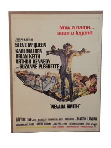 Original movie poster for "Nevada Smith" starring Steve McQueen, Karl Malden, Brian Keith, Arthur Kennedy and Suzanne Pleshette. 1966. Numbered 66/89. Nevada Smith is a 1966 American Western film directed by Henry Hathaway and starring Steve McQueen, Karl Malden, Brian Keith, Arthur Kennedy, and Suzanne Pleshette. It is a prequel to the 1961 film The Carpetbaggers, and it tells the story of Max Sand, a young man who is orphaned and left to fend for himself in the Old West. Creasing at the top and bottom. Back on cardboard and covered in plastic. Very Fine Condition. (41"x31")
