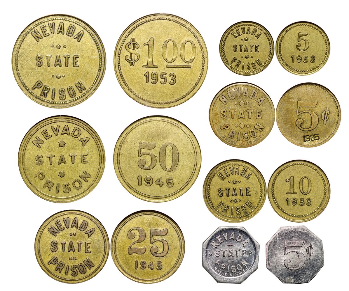 The Nevada State Prison Token Collection of 36 different pieces offered here started with Hal Dunn’s Collection and has been added to over the years, but only barely. Hal used to tell me how frustrated he was at trying to get the older tokens, and how rare they were (fh). Dating the tokens from this collection is very difficult. While the later tokens (post-1936) are dated, the earlier tokens are not. Only one of the tokens has a manufacturer, the rest do not. It is unknown if the tokens were made onsite, or whether some were continued to be made by Moise, but lack the imprint.Undated Tokens (14):N.S.P., 5c. c1905-10. Rd, Br.Nevada/State/Prison//5c (2 varieties); 10c. Rd, Br., c1905-12Octagonal, brass, c 1910-20(?):Nevada/-/*State*/-/Prison/Mosie-K Co. S.F.//5c, aluminum (gem unc.)Nevada/State/Prison//25Nevada/-*-/*State*/-*-/Prison, 50c, $1. Different borders, same lettering designNevada/-/*State*/-/Prison, 1c (new style lettering), 10c (old style lettering)Round, brass, c1910-20Nevada/”*”/State/”*”/Prison. 50c, $1. Old style lettering.Nevada -*-/*State*/-*-/Prison. 10c, $1. Newer style letters (no serifs) Dated Tokens (22):1935: These tokens are from the above undated group, and have all been date punched on the reverse at a later date (1935) than when made (presumably before 1920). This group has 4 different pieces.1945: 25, 50 (rd, br)1953: 5c, 10c, 25c, 50c, $11959: $1, $5 (gem unc.)1961: 5c, 10c, 25c1962: 5c, 10c, 25c, 50c, $1, $5 - HKA#66176