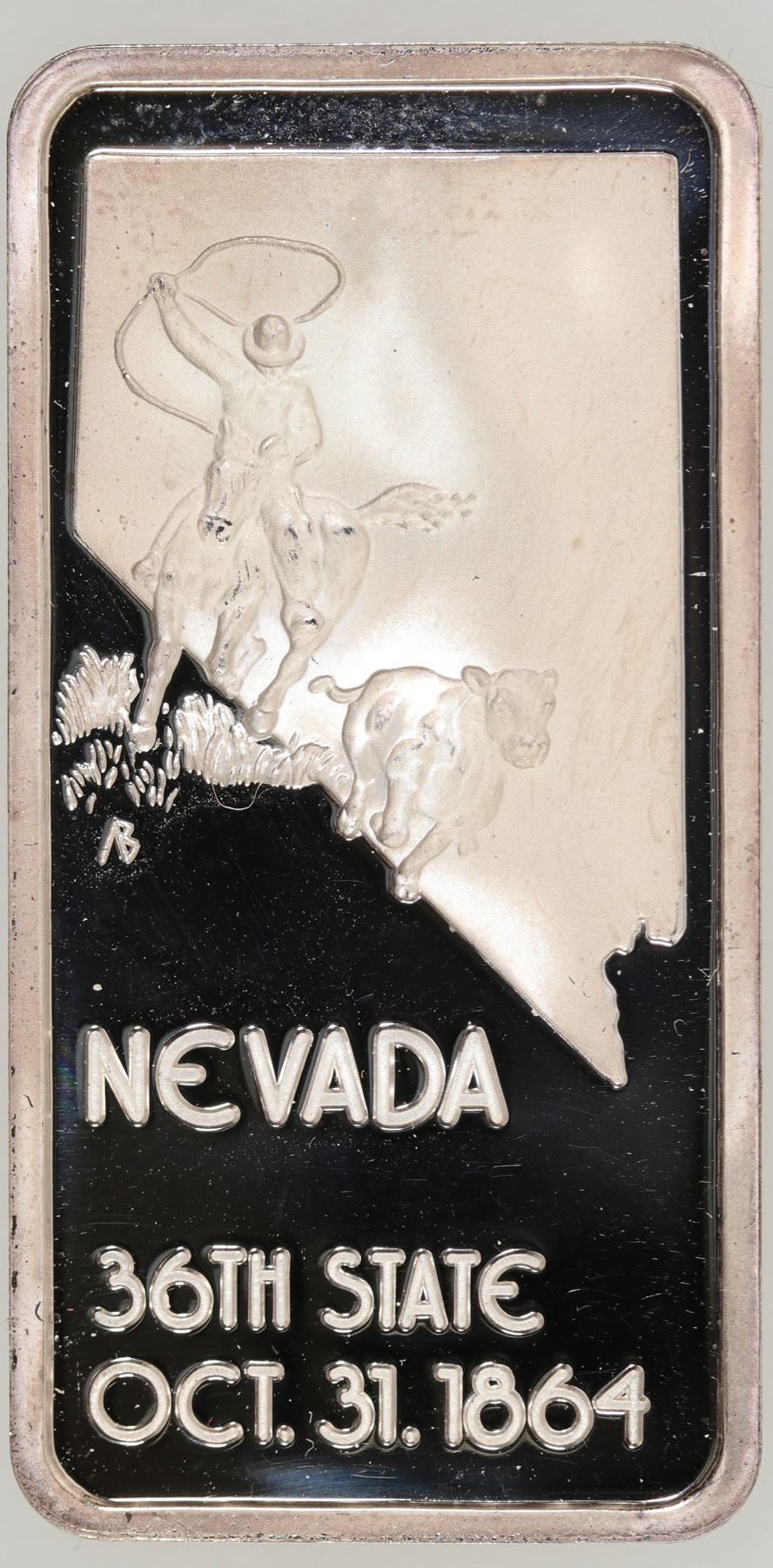 Beautiful ingot commemorating the 36th state: The Silver State. Obverse: map of Nevada, cowboy roping a steer; Nevada / 36th State / Oct. 31, 1864. Reverse: Nevada / Thirty-Sixth State / Capital - Carson City / One Troy Oz. / .999ESHM75P. (Hamilton Mint, made 1975). City: State:Nevada Date: