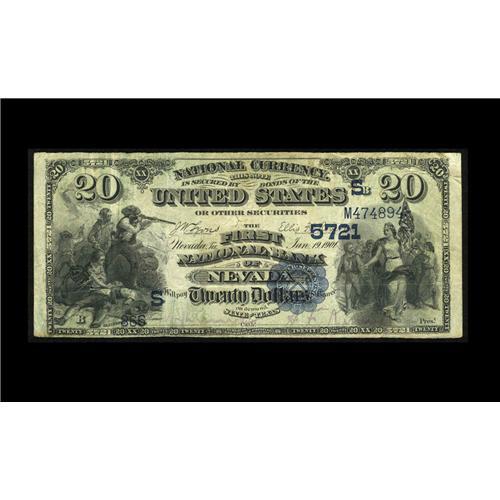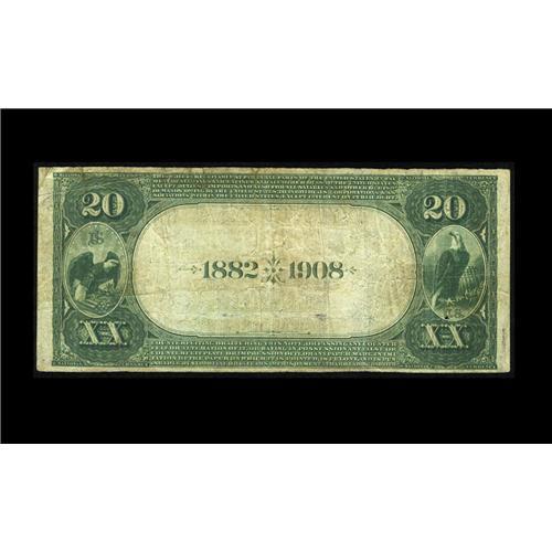 <B>Nevada, TX</B></I> - $20 1882 Date Back Fr. 555 <B>The First NB</B></I> Ch. # (S)5721<BR>An extremely rare Collin County bank in large size, with four of the nine reported examples from this north Texas community permanently impounded in the Moody Foundation holdings. This piece, which is new to the census, is the only Date Back of any denomination known to exist. Pleasing <B>Fine-Very Fine.</B></I>