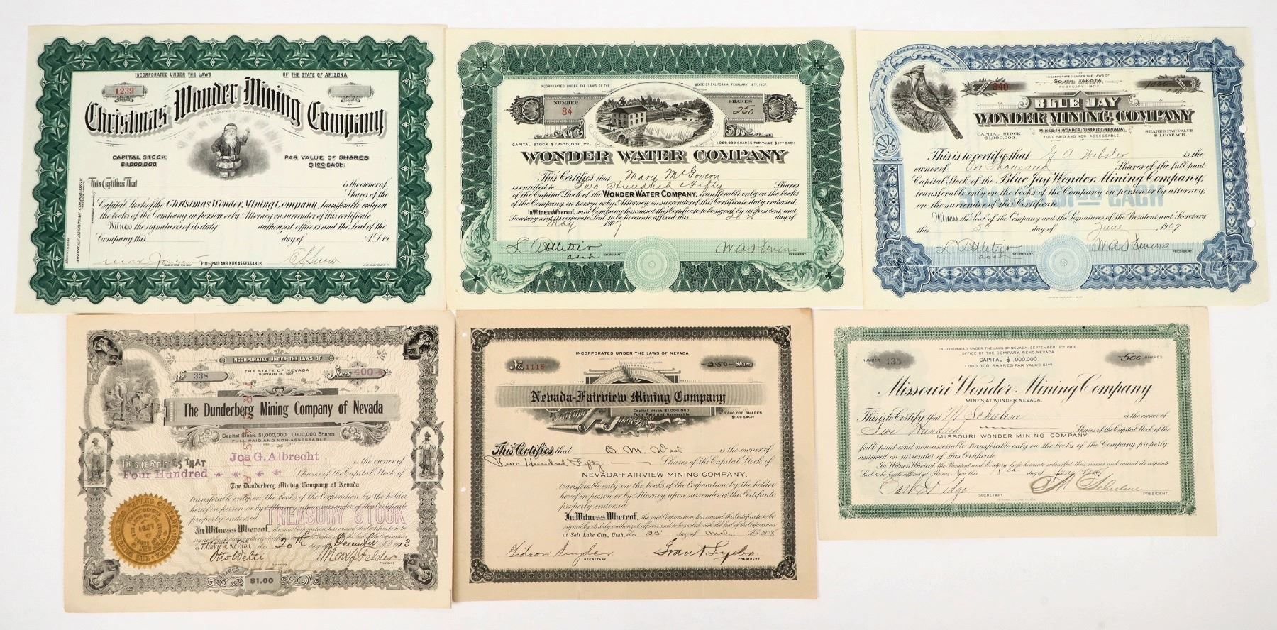 Lot of 6. U/U.I/C. Vg or better. The Dunderberg Mining Co. of Nevada issued 1913, Treasury Stock. Blue Jay Wonder Mining Co. issued 1907. Nevada-Fairview Mining Co. issued 1908. Christmas Wonder Mining Co. dateline 19__. Missouri Wonder Mining Co. issued 1907. Wonder Water Co. issued 1907