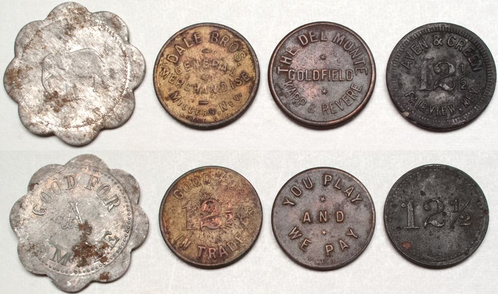 1) Aven & Green / 12 1/2 / Fairview, Nev // '12 1/2.' 2) The Del Monte / Goldfield / Kapp and Revere // You play and we pay. 3) Dale Bros / General Merchandise / Millers, Nev // GF 12 1/2c IT. 4) Pictorial token with an elephant. "Good for a Smile."City: County: State: NVDate: