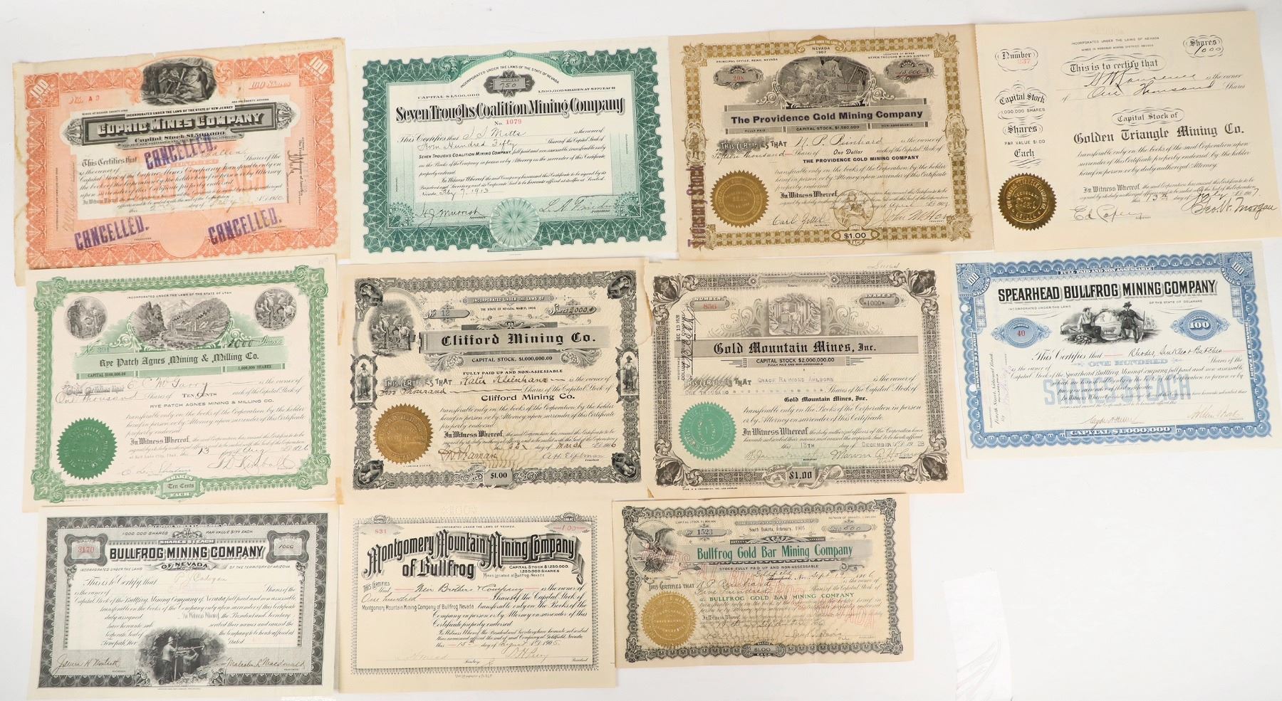 Lot of 11. I/U, I/C. Issued 1908-28. Fair or better cond. Bullfrog mining district : Cupric Mines Co. , Spearhead Bullfrog Mining Co. , Montgomery Mining Co. of Bullfrog. , Bullfrog Gold Bar Mining Co.. Clifford Mining Co . Rye Patch mining dist.: Rye Patch Mining & Milling Co. Rosebud mining district: Golden Triangle Mining Co. Seven Troughs Mining District: Seven Troughs Coalition Mining Co. , The Providence Gold Mining Co.