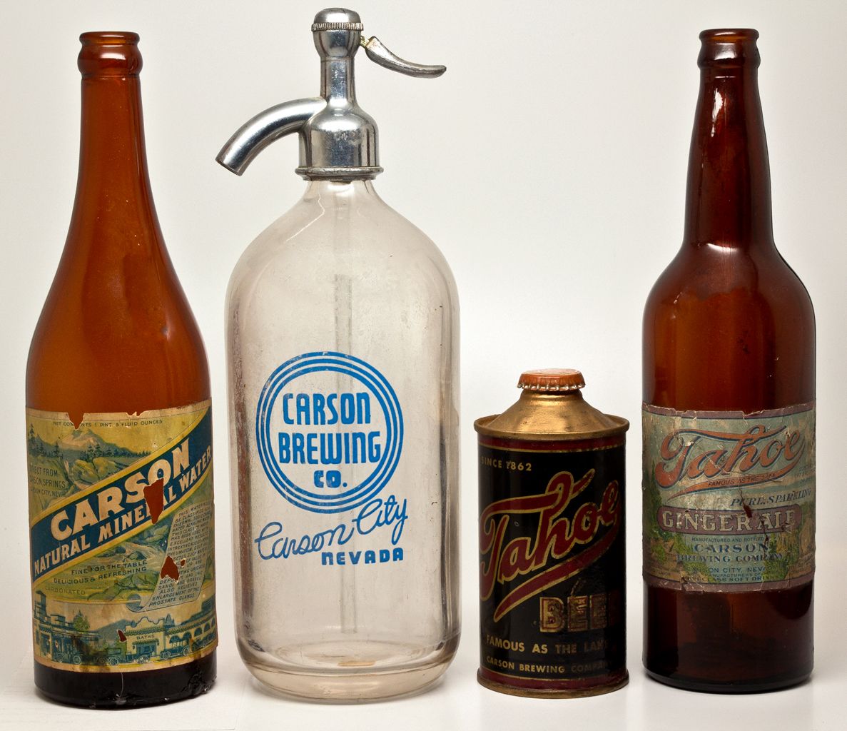 Lot of 4 including: 1) One late-prohibition era seltzer bottle, measures about 11.5 inches tall, with chrome top, by approximately 4 inches wide. Siphon tube intact. “Carson Brewing Co.” silk screened within a blue, 3-ring border. Script “Carson City” and plain “Nevada” silk screened below logo. Bottom bears no maker’s mark. Clear glass, no chips, little interior staining. This seltzer is considered rare, and may date from the late prohibition period. 2) One short beer can, measuring about 5.5" with cap by 2.5". The original label on the can is printed in blue, red, and gold “Since 1862/ Tahoe/ Beer/ Famous As The Lake/ Carson Brewing Company.” An additional panel of the label, on the side, is inscribed “This is the/ ‘Cap Sealed’/ Beer Can/ It brings TAHOE BEER/ to you with its fine flavor/ unimpaired—light cannot/ penetrate it. It visits no/ home but yours. It cools/ quickly and takes up little/ space. Open it like a bottle./ Drink from it if you wish./ When empty throw away./ No empties to return. No/ ‘extras’ or deposits./ Internal Revenue Tax Paid/ Permit Nev. U-1110/ Net Contents/ 12 Fluid Ounces/ Brewed and Packed by/ Carson Brewing/ Company/ Carson City, Nevada/ C. C. co. 32-I-A PAT. APPL’D FOR” in red lettering. The bottom bears no markings. The matching cap is printed “Famous/ Tahoe/ Beer/ As The Lake” and the top and bottom of the can are a rich copper color. This cone top beer can dates circa 1920-1948. 3) One tooled, crown top bottle measuring 11.5" by about 3". Original paper label is printed “Carson/ Natural Mineral Water/ Fine for the Table/ Delicious & Refreshing.” The bottom bears no maker’s mark. Amber glass, one small bubble. 4) One tooled, crown topped bottle measuring 11.5" by 3". Original paper label is printed “Tahoe/ Famous as the lake/ Pure Sparkling/ Ginger Ale” and the bottom bears no maker’s mark. The Carson Brewing Company was “certainly one of the first breweries in the State of Nevada, established in 1860 by John Wagner & Co. at about the same time the Pioneer Brewery was built in Carson City” and began bottling sodas in 1915 [Ref: Nevada History Through Glass, Vol 1, Fred Holabird, 2012, p. 319]. These bottles with original labels are exciting additions to any enthusiast’s collection. - Jacobitz Collection -59517