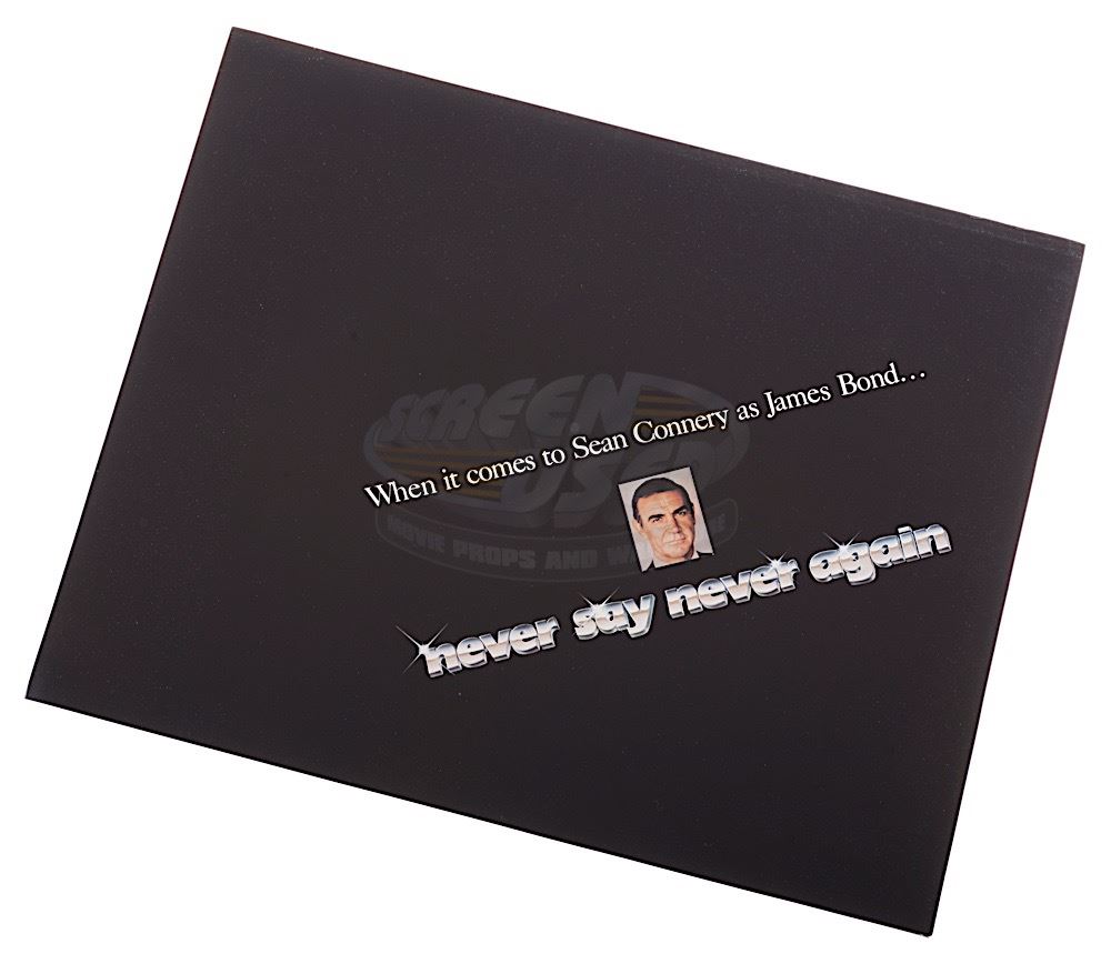 (Warner Bros., 1983) A rare fold-out produced by the studio and sent to various movie theater owners to pitch the film. The fold-out features the film's title and a small window that reveals the image of James Bond (Sean Connery) on the cover and opens to the image of James Bond's ID wallet in the bikini bottoms of a sunbathing girl with the film's title. Measures 17.25" x 28" unfolded.