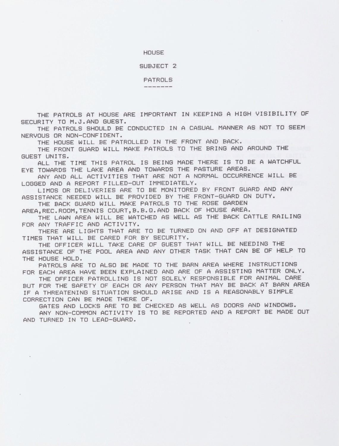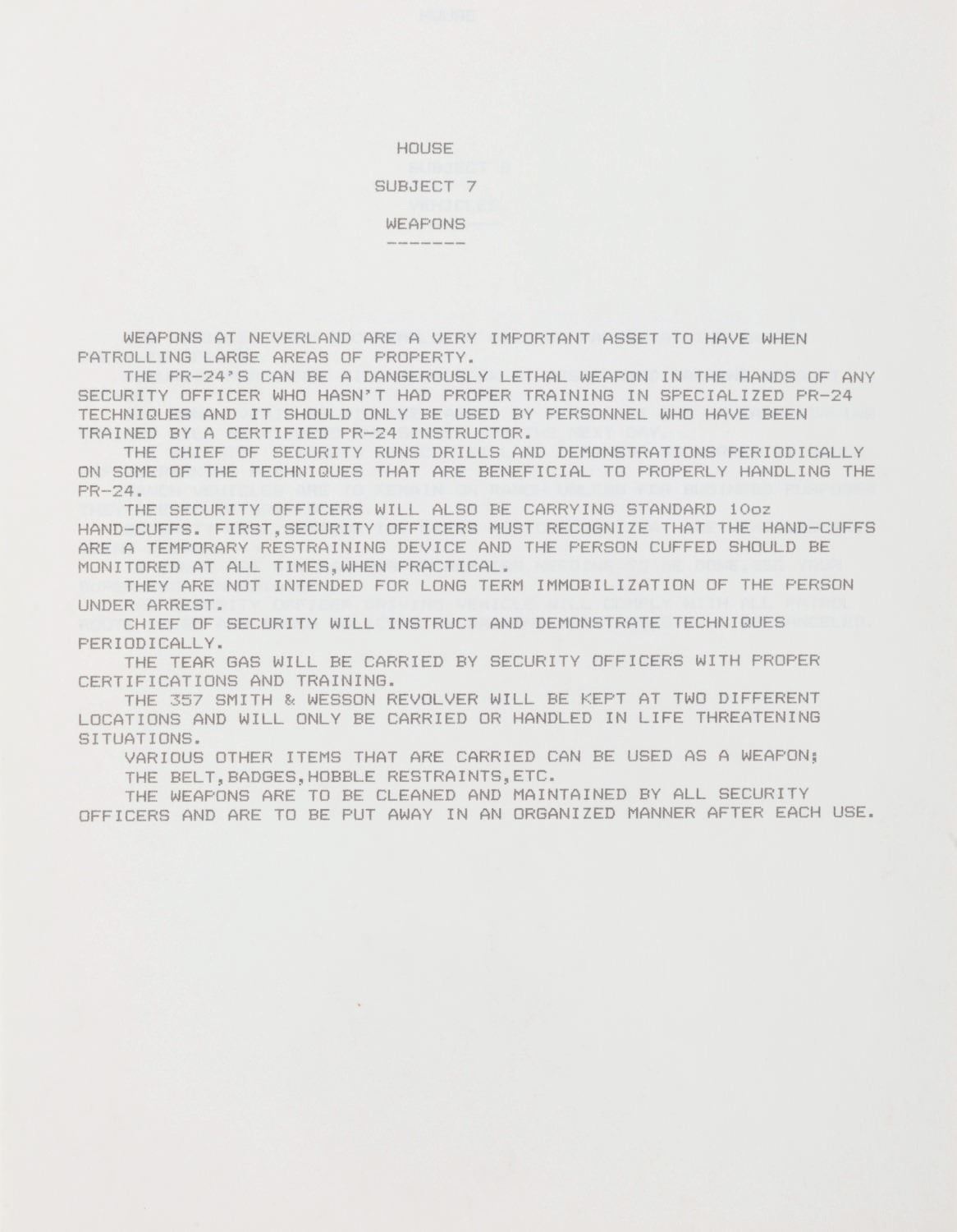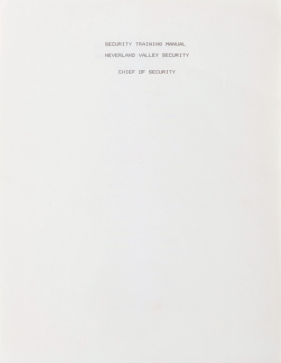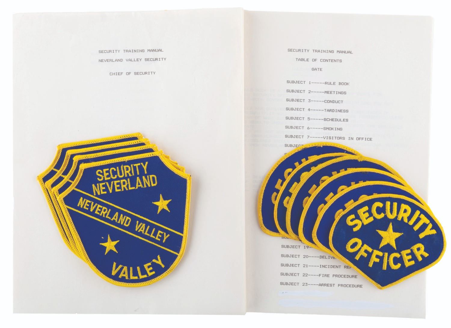 (Michael Jackson, 1980s) A collection of security uniform patches and handbooks from Michael Jackson's Neverland Ranch. Included are six 3.5” x 4.5” security officer patches, and four 5” x 4.75” Security Neverland Valley Patches. The two Security Officer Manuals are looseleaf pages, printed using a dot matrix printer, dating to the earliest days of Neverland Ranch, which Jackson purchased in 1988. The manuals give an overview of Security practices and procedures for the Ranch, including sections on how to deal with fans, trespassers, and other possible incidents. Each manual is in a well-worn plain manila envelope, one marked to the attention of Bill Bray, who performed security for the Jackson family in their early touring days and was personally close to Michael. Measuring 8.5” x 11”, the loose manuals are in very good to fine condition, one original print and the other a Xerox copy. The patches are in very good to fine condition, with four of the smaller patches showing wear from use.