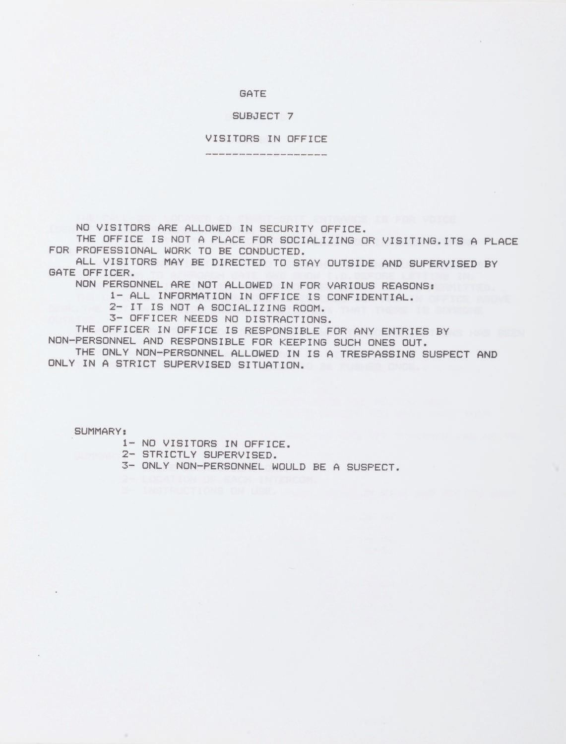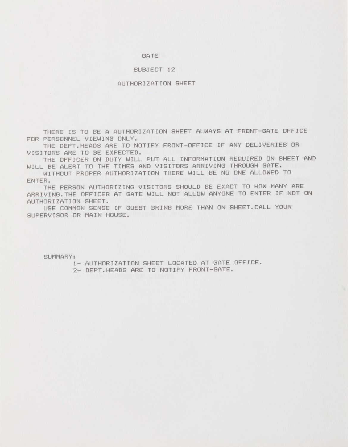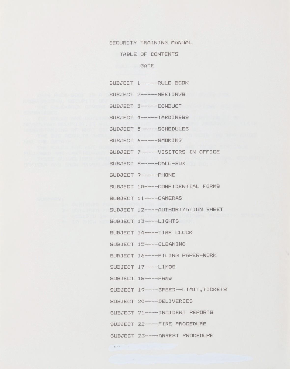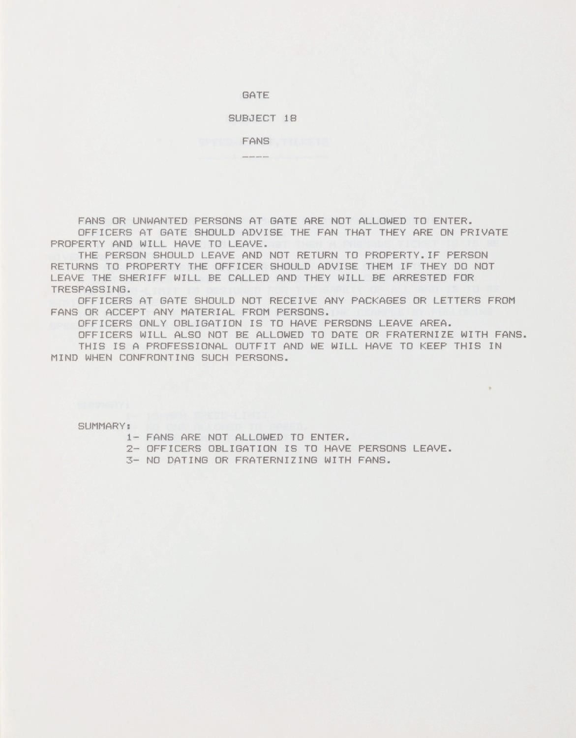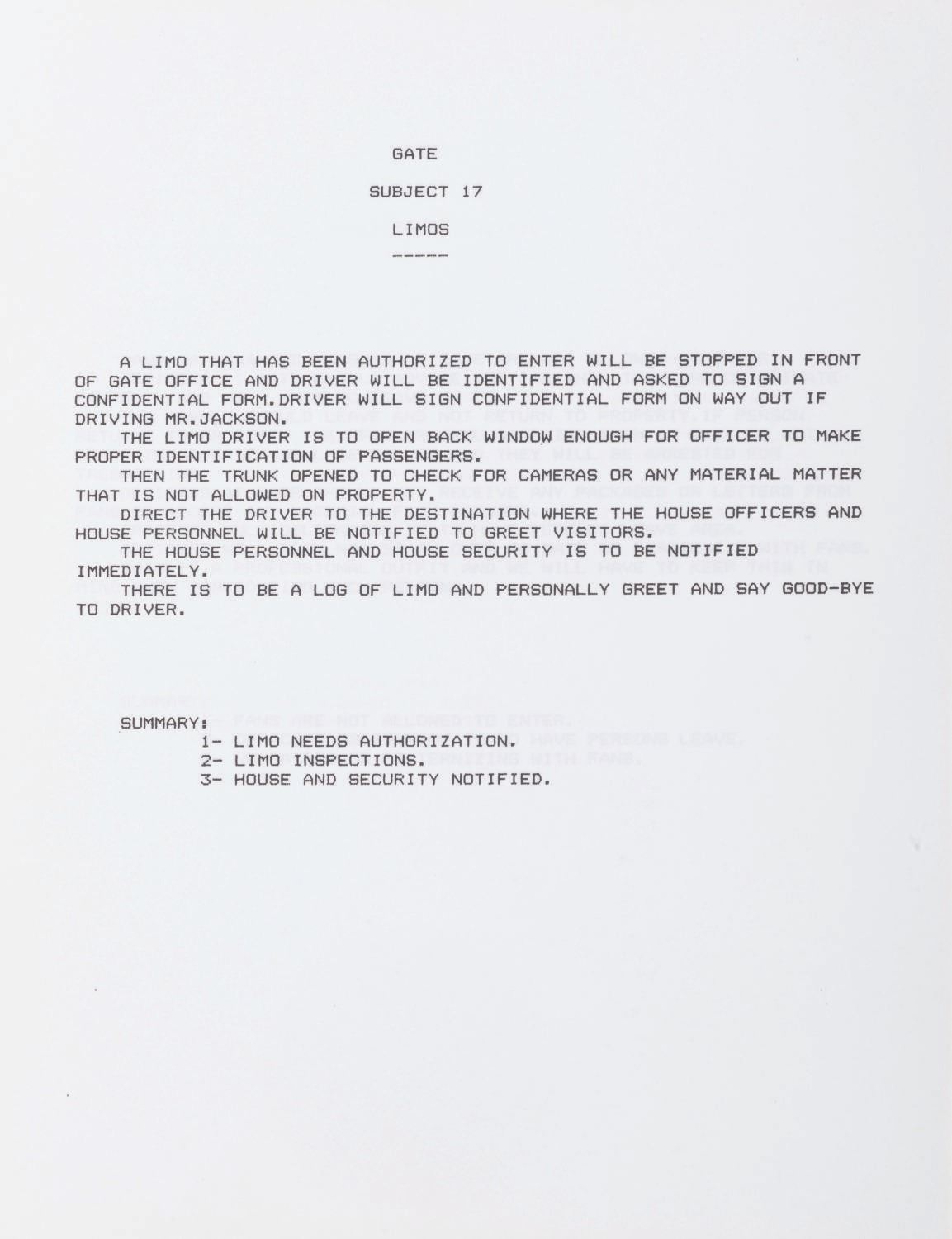 (Michael Jackson, 1980s) A collection of security uniform patches and handbooks from Michael Jackson's Neverland Ranch. Included are six 3.5” x 4.5” security officer patches, and four 5” x 4.75” Security Neverland Valley Patches. The two Security Officer Manuals are looseleaf pages, printed using a dot matrix printer, dating to the earliest days of Neverland Ranch, which Jackson purchased in 1988. The manuals give an overview of Security practices and procedures for the Ranch, including sections on how to deal with fans, trespassers, and other possible incidents. Each manual is in a well-worn plain manila envelope, one marked to the attention of Bill Bray, who performed security for the Jackson family in their early touring days and was personally close to Michael. Measuring 8.5” x 11”, the loose manuals are in very good to fine condition, one original print and the other a Xerox copy. The patches are in very good to fine condition, with four of the smaller patches showing wear from use.