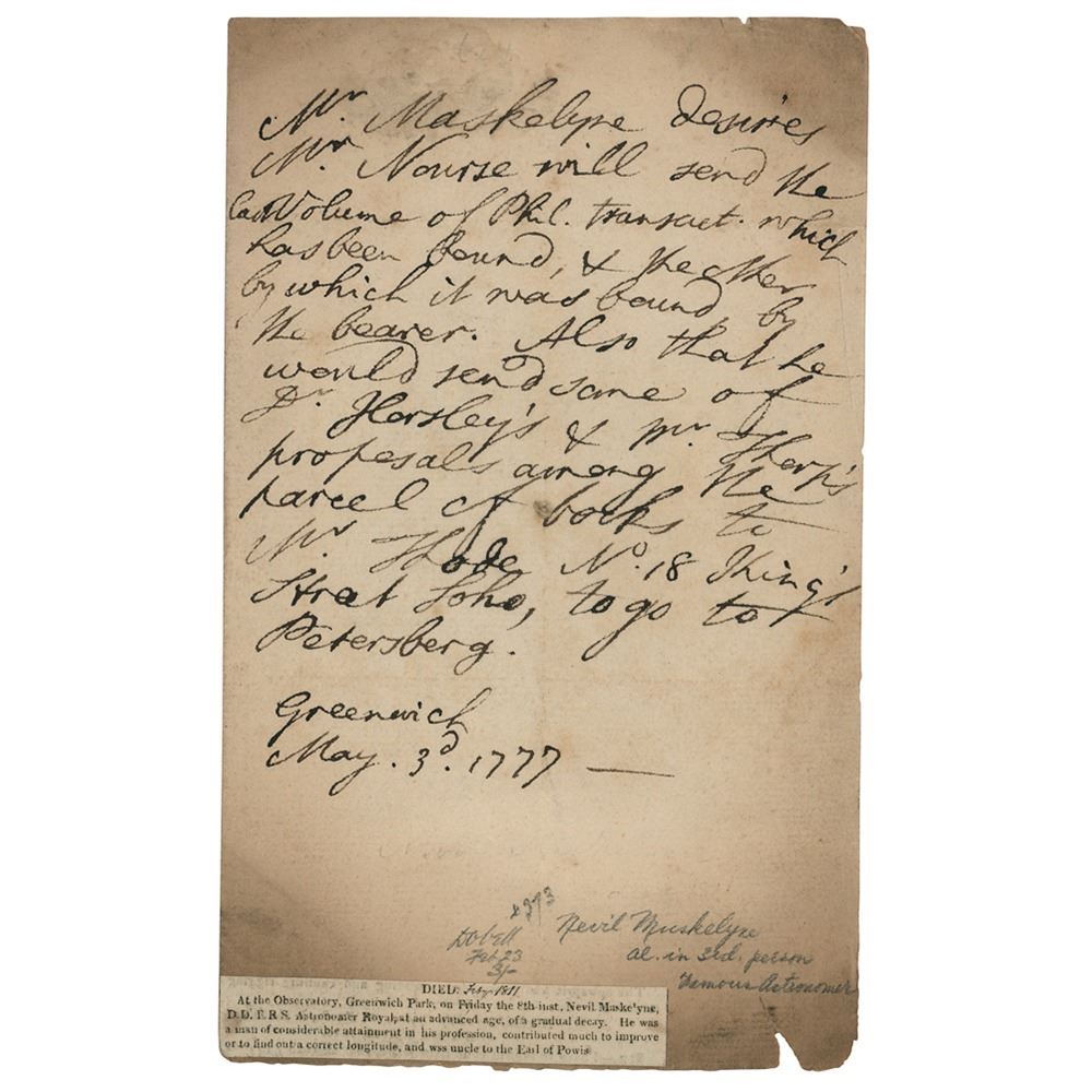 British Astronomer Royal who held the office from 1765 to 1811, and was the first person to scientifically measure the mass of the planet Earth (1732–1811). ALS signed “Mr. Maskelyne,†one page, 4.5 x 7.5, May 3, 1777. Handwritten letter to "Mr. John Nourse, Bookseller to his Majesty," in part: "Mr. Maskelyne desires Mr. Nourse will send the last Volume of Phil. transact. which has been bound, & the other by which it was bound, by the bearer. Also that he would send some of Dr. Horsley's & Mr. Thorp's proposals among the parcel of books." In very good to fine condition, with light soiling, irregular toning, a few short edge tears, and old biographical clipping affixed at the bottom.