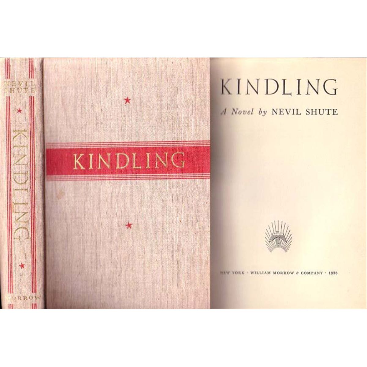 ''Kindling'' by Nevil Shute. New York: William Morrow & Company: 1938. First edition rare book with scarce unclipped dustjacket. Gilt lettering and red decoration on backstrip and front board in perfect condition. Clean pages. Tight binding. Unclipped dustjacket shows $2.50 on inside flap. Dustjacket in good condition and extremely scarce. Minor flaws include small stain on front board, small finger mark on half title page, small tears at jacket's edges. Near fine condition of this rare book.