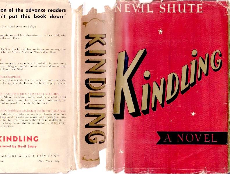 “Kindling” by Nevil Shute. New York: William Morrow & Company: 1938. First edition rare book with scarce unclipped dustjacket. Gilt lettering and red decoration on backstrip and front board in perfect condition. Clean pages. Tight binding. Unclipped dustjacket shows $2.50 on inside flap. Dustjacket in good condition and extremely scarce. Minor flaws include small stain on front board, small finger mark on half title page, small tears at jacket's edges. Near fine condition of this rare book.